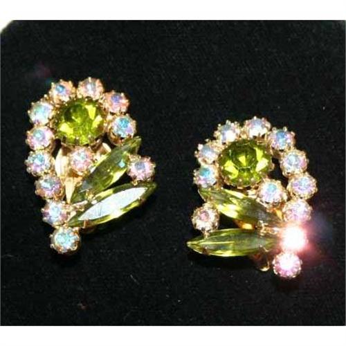 These vintage 1950s Earrings are so beautiful! Emerald Green Chatons and elongated Navette Rhinestones depict the center flower framed with fiery Chaton Aurora Borealis Rhinestones. All stones are multi-faceted, prong set and placed in a gold plated metal for the ultimate sparkle! Measuring 1 inch long by ¾ of an inch wide, securing with a clip-back closure.