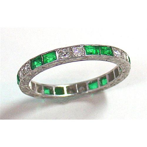 1930s platinum band with beautifully engraved sides. Set with 12 emeralds and 12 round diamonds. Total approximate diamond weight .25ct G-H color VS quality. 2mm wide.
