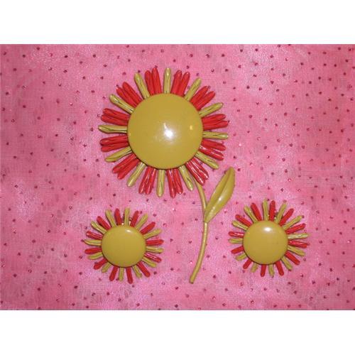 ***REASONABLE DIRECT-PURCHASE, PRE-AUCTION OFFERS CONSIDERED - ITEMS TO BE SOLD VIA GO ANTIQUES VENUE ONLY (PLEASE DO NOT REQUEST OFF-VENUE SALE)! Vintage 1960s NEAR MINT CONDITION Hippie Retro Mod Enamel Reddish-Orange & Goldenrod/Mustard Yellow Daisy/Daisies Sunflowers/Flowers/Floral Brooch/Pin & Clip-On Earrings Set/Suite
