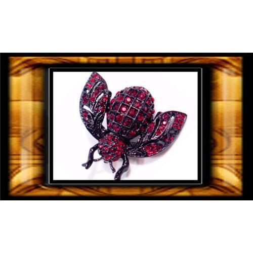 The deep red on these stones is darker than the photos and really rich looking. THe black enamel setting really makes them stand out too!. This is a fly or a moth and it measures 1 1/2" wide and 1 1/3" long. MUCH nicer than the photos this really looks great when you wear it on a black shirt!