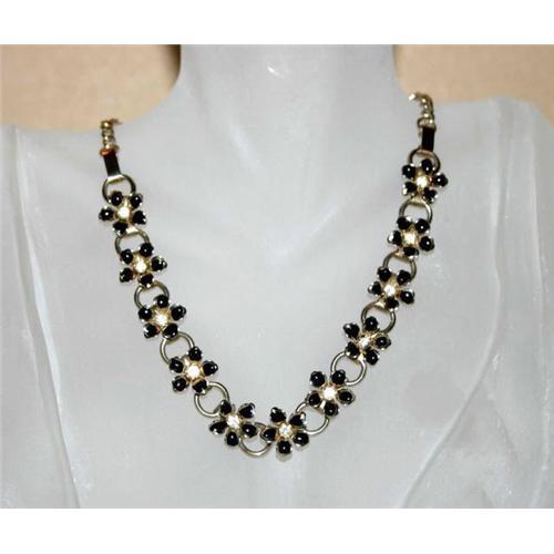This is a great Vintage unmarked Necklace made in the 1950s. Small linked 1/2 inch black enameled flowers, set with small foil-backed sparkling white rhinestones. There are eleven flowers linked together with a gold tone jump ring. Measuring 15 1/2 inches in length including extender, closing with a C hook.