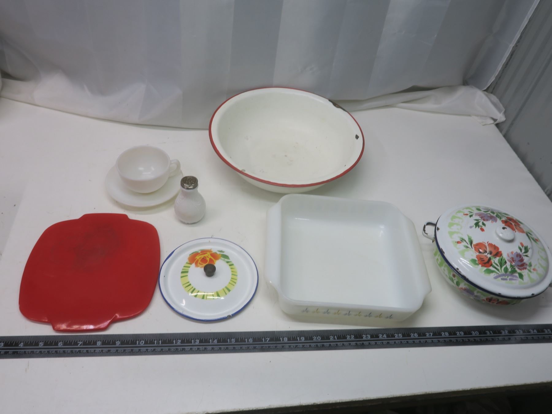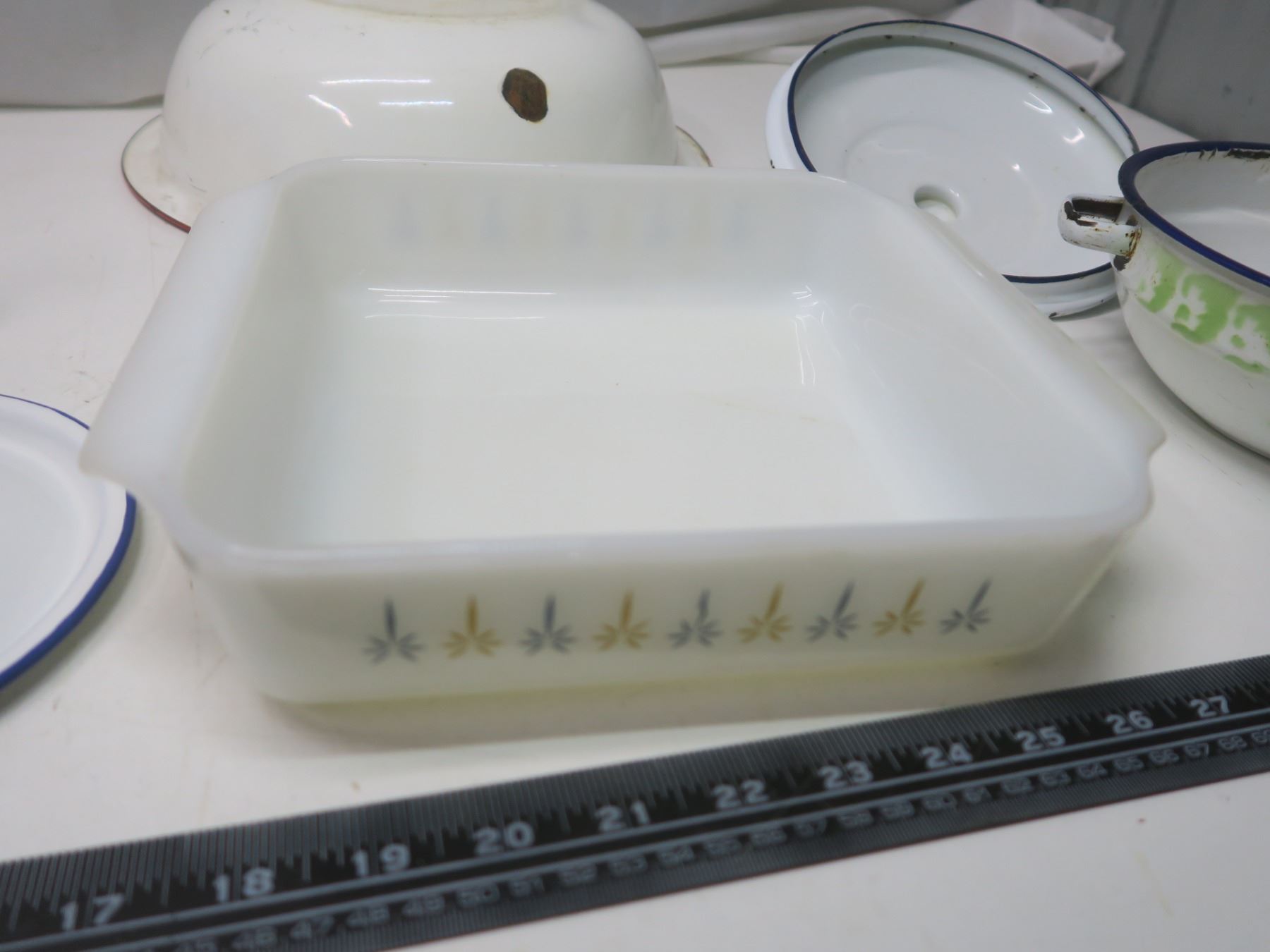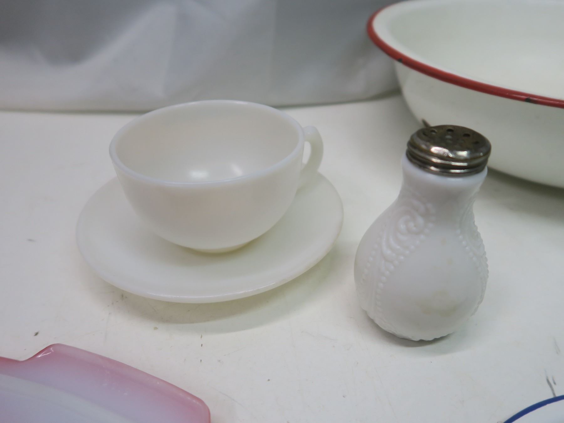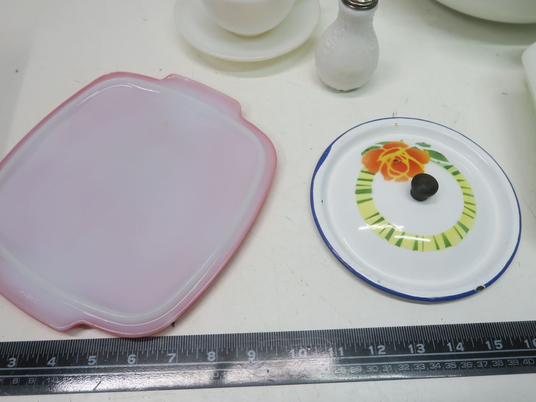 Vintage Enamelware, Milk Glass, Pyrex Lid, Fire King