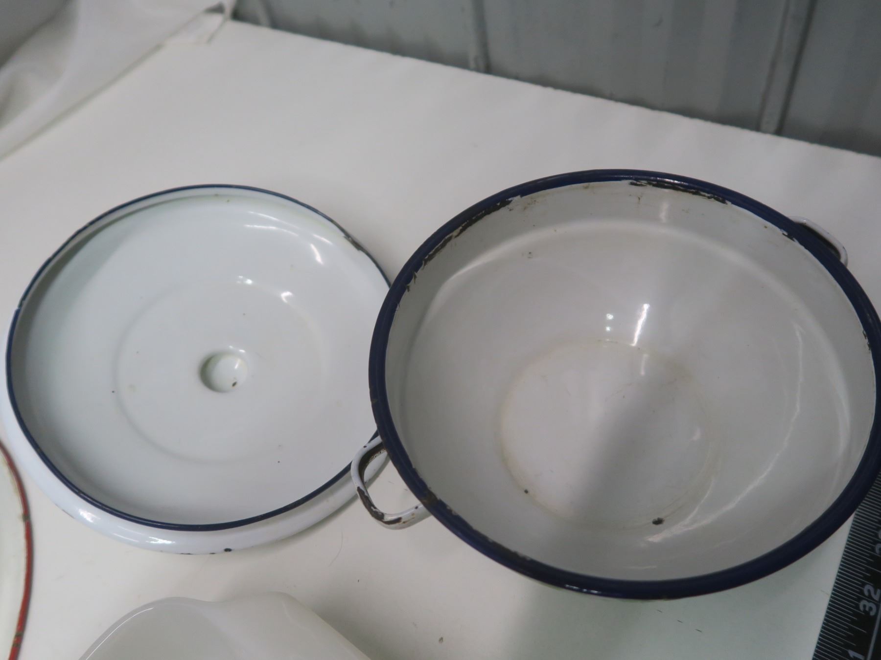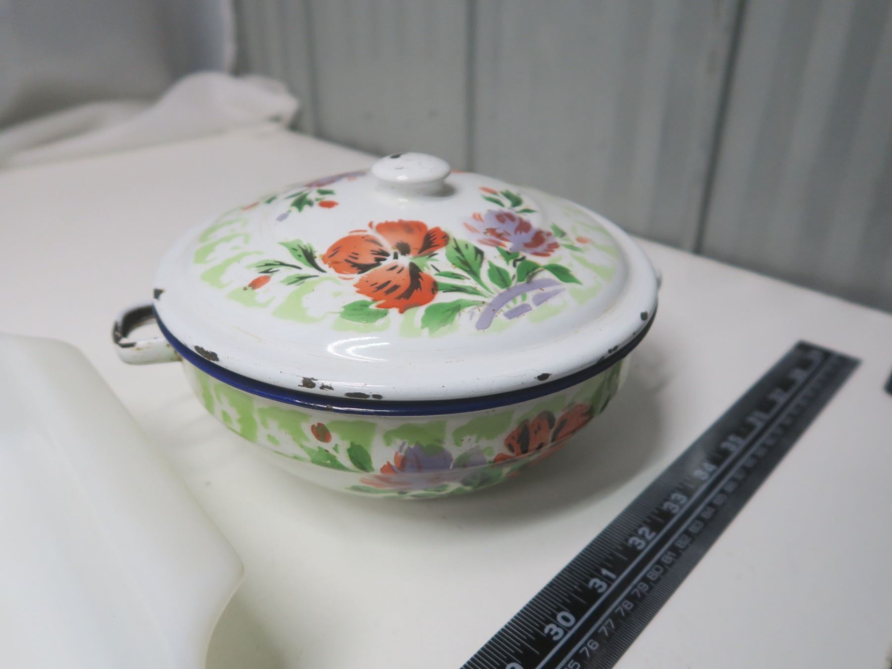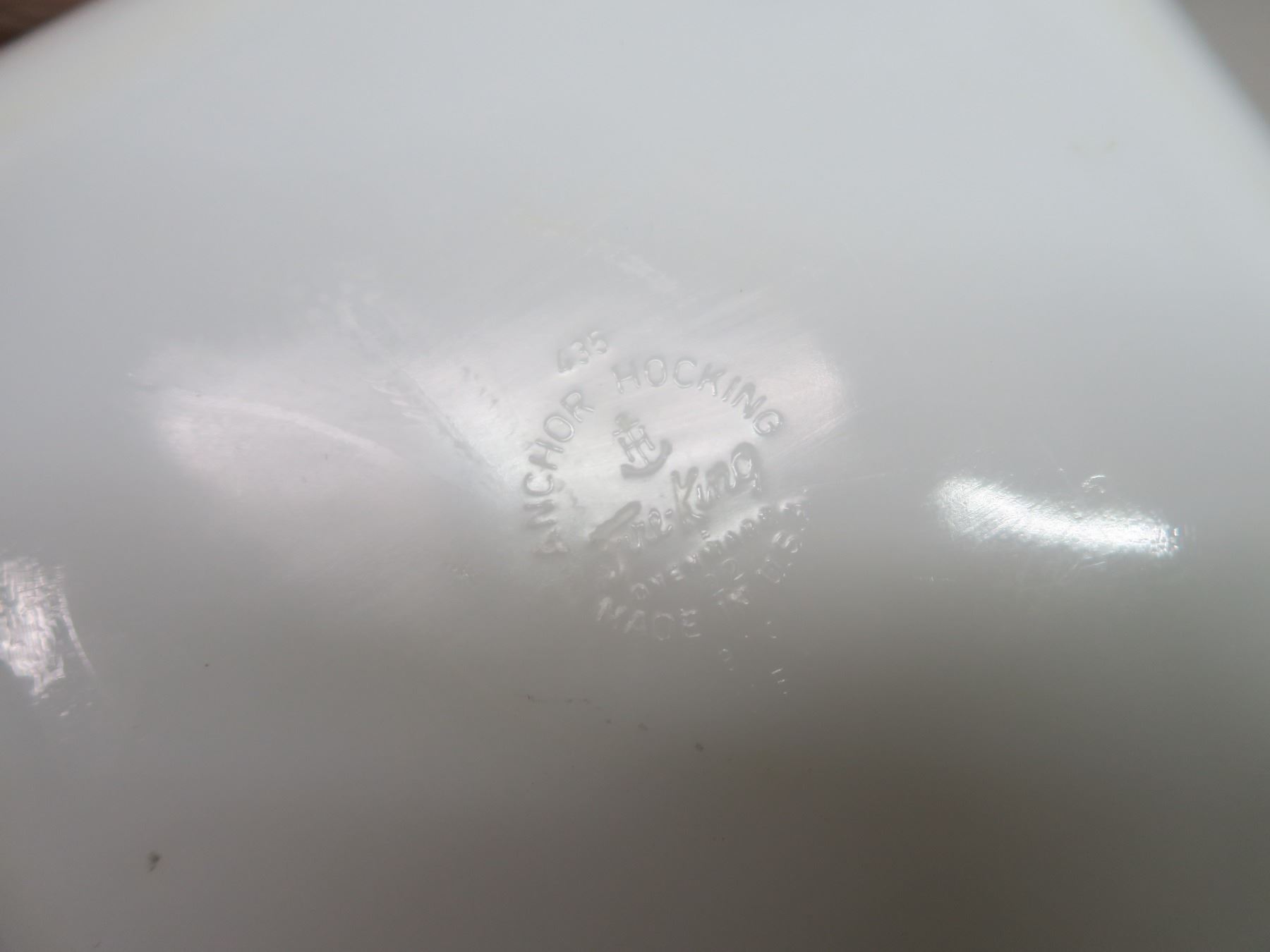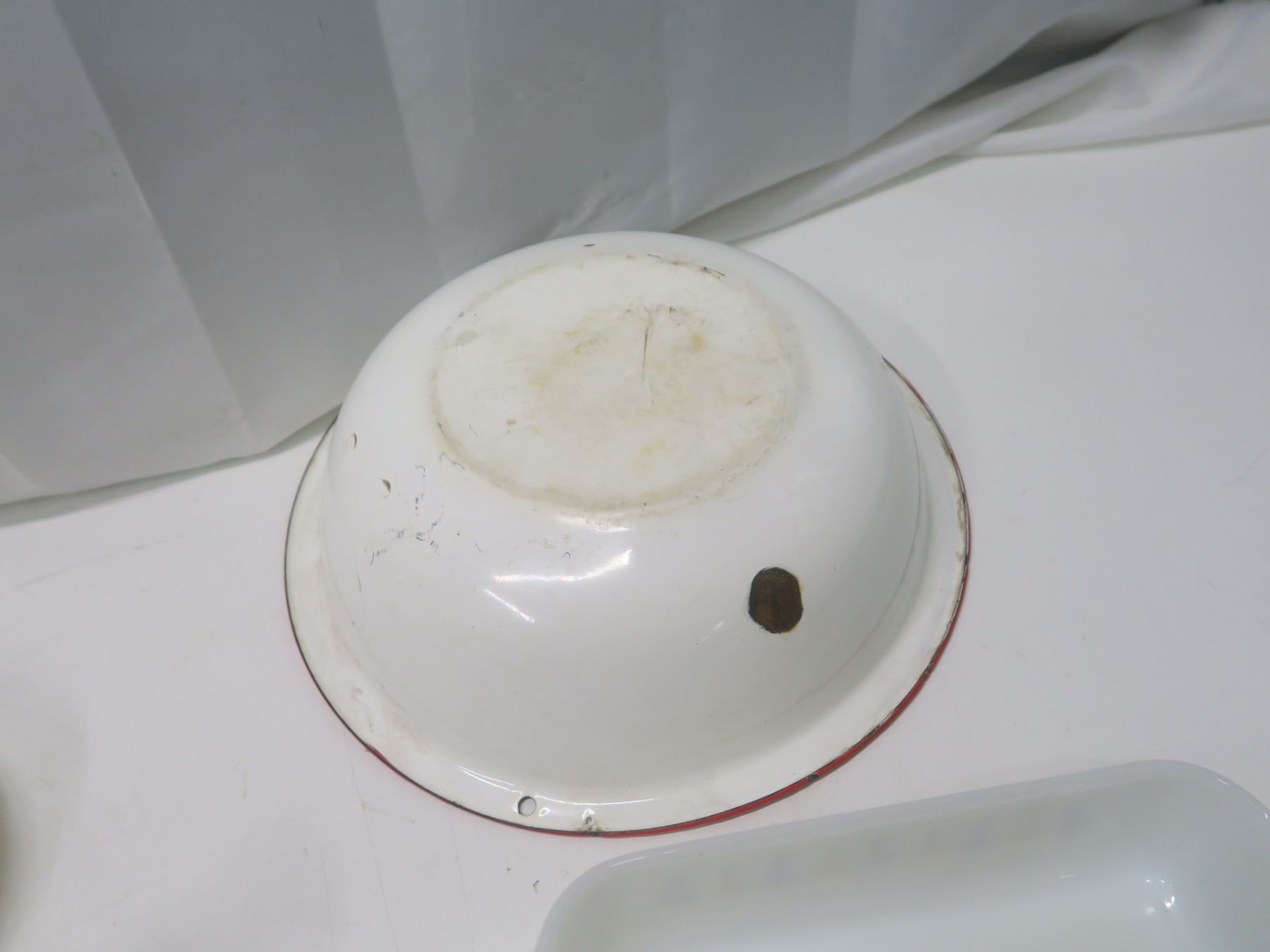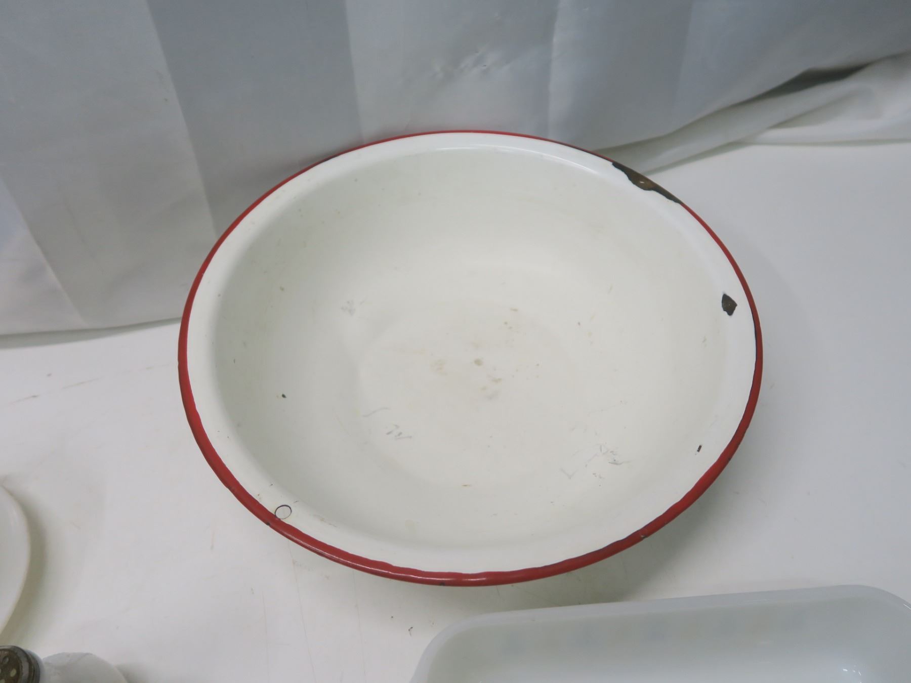 Vintage Enamelware, Milk Glass, Pyrex Lid, Fire King