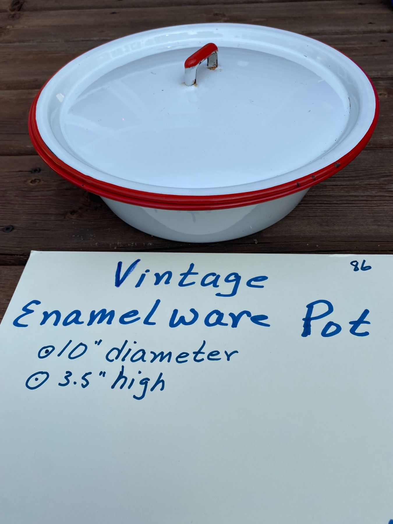 Round white enamelware pot with red trim. 3.5” high and 10” in diameter.