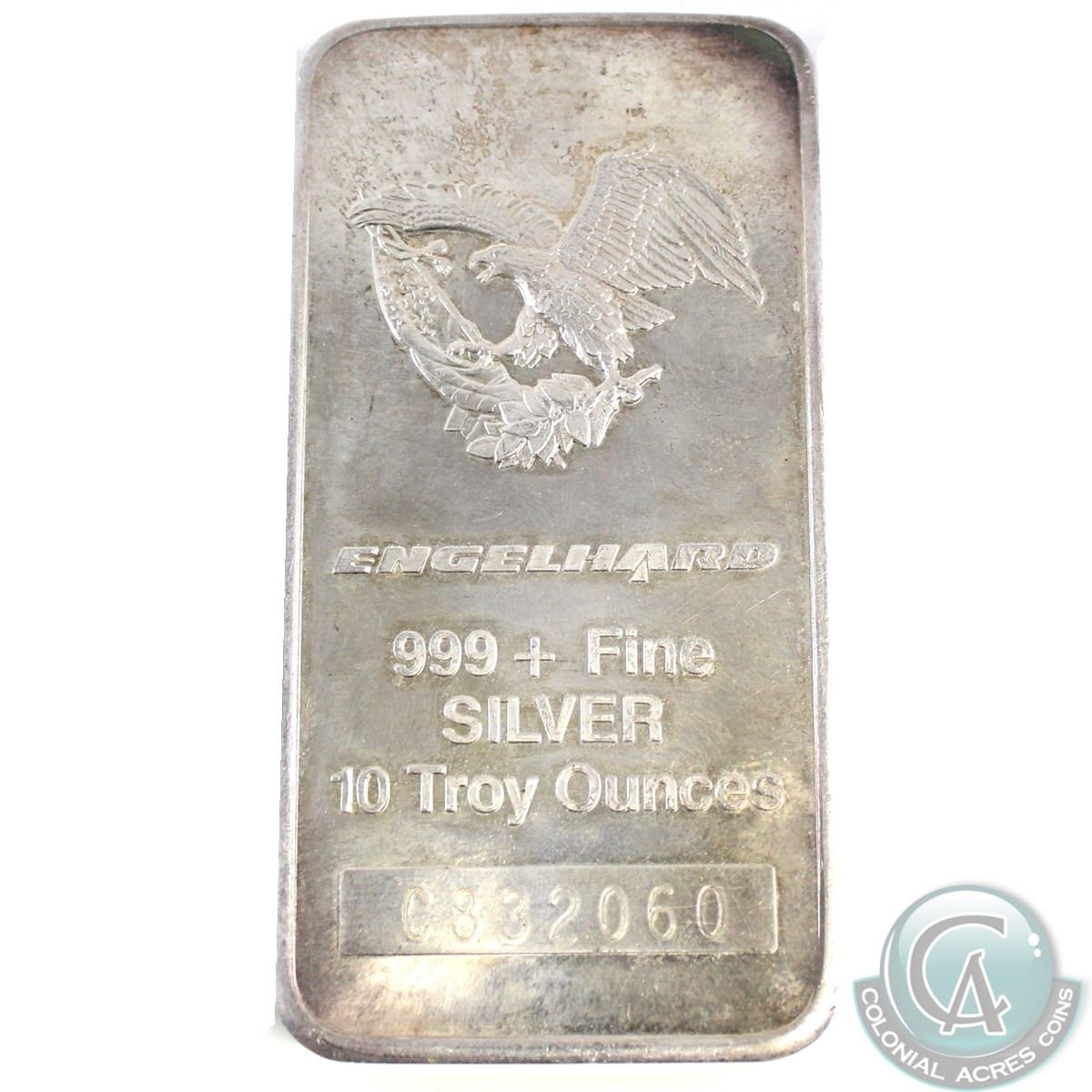 Vintage Engelhard 10oz 999+ Fine Silver Bar (TAX Exempt). Serial # C832060 - 3rd series standard commercial bar in C-Series variation, 1987 mintage.