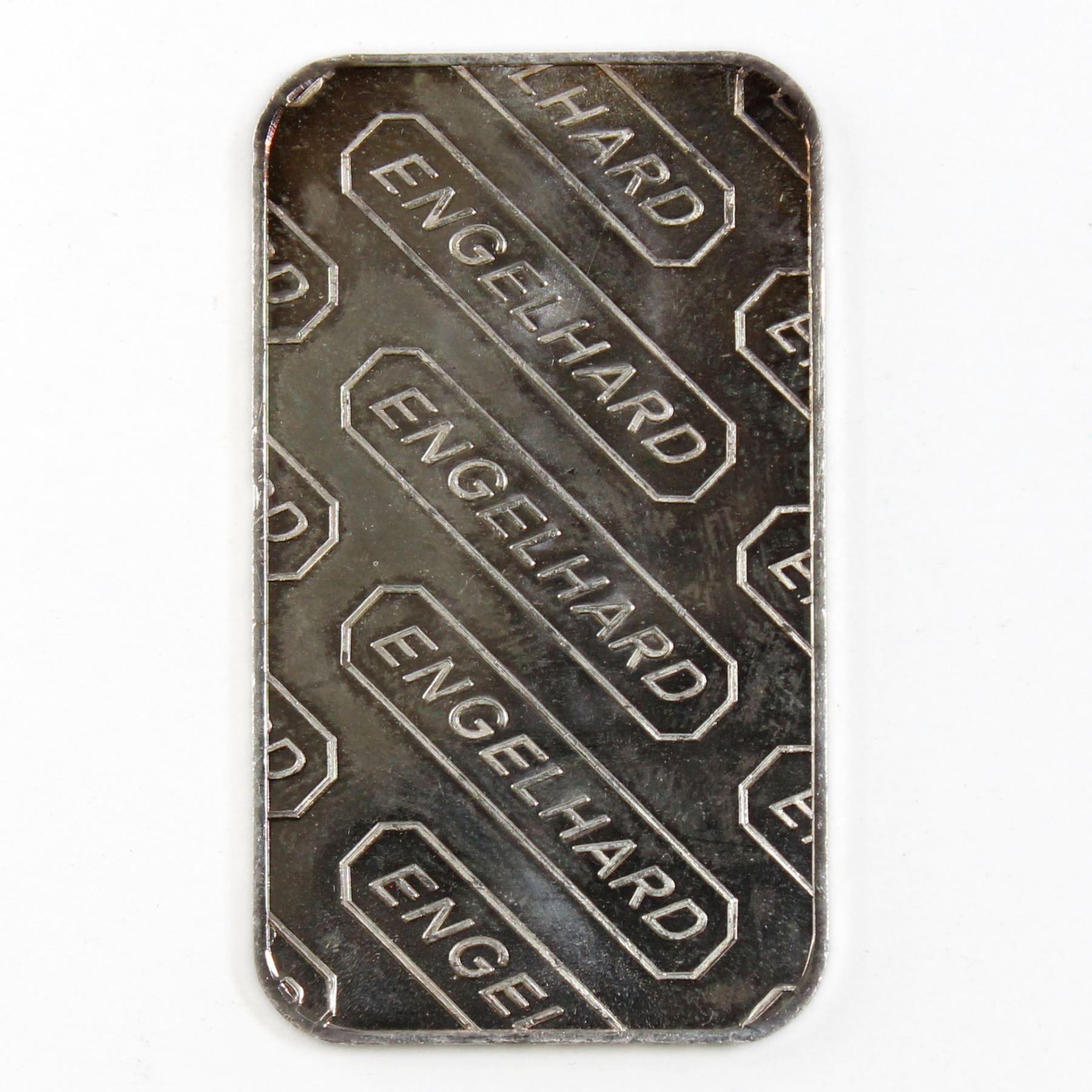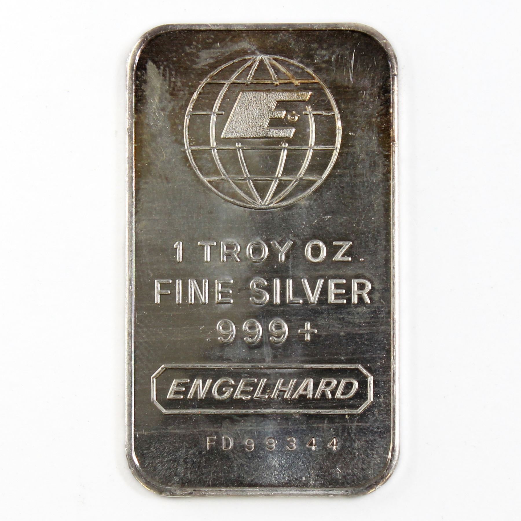 Vintage Engelhard 1oz fine silver bar 'Wide E at top of Globe'. Serial # FD99344. (Tax Exempt)