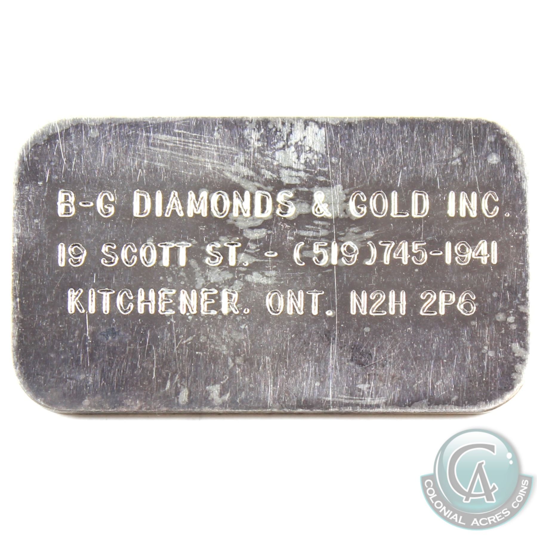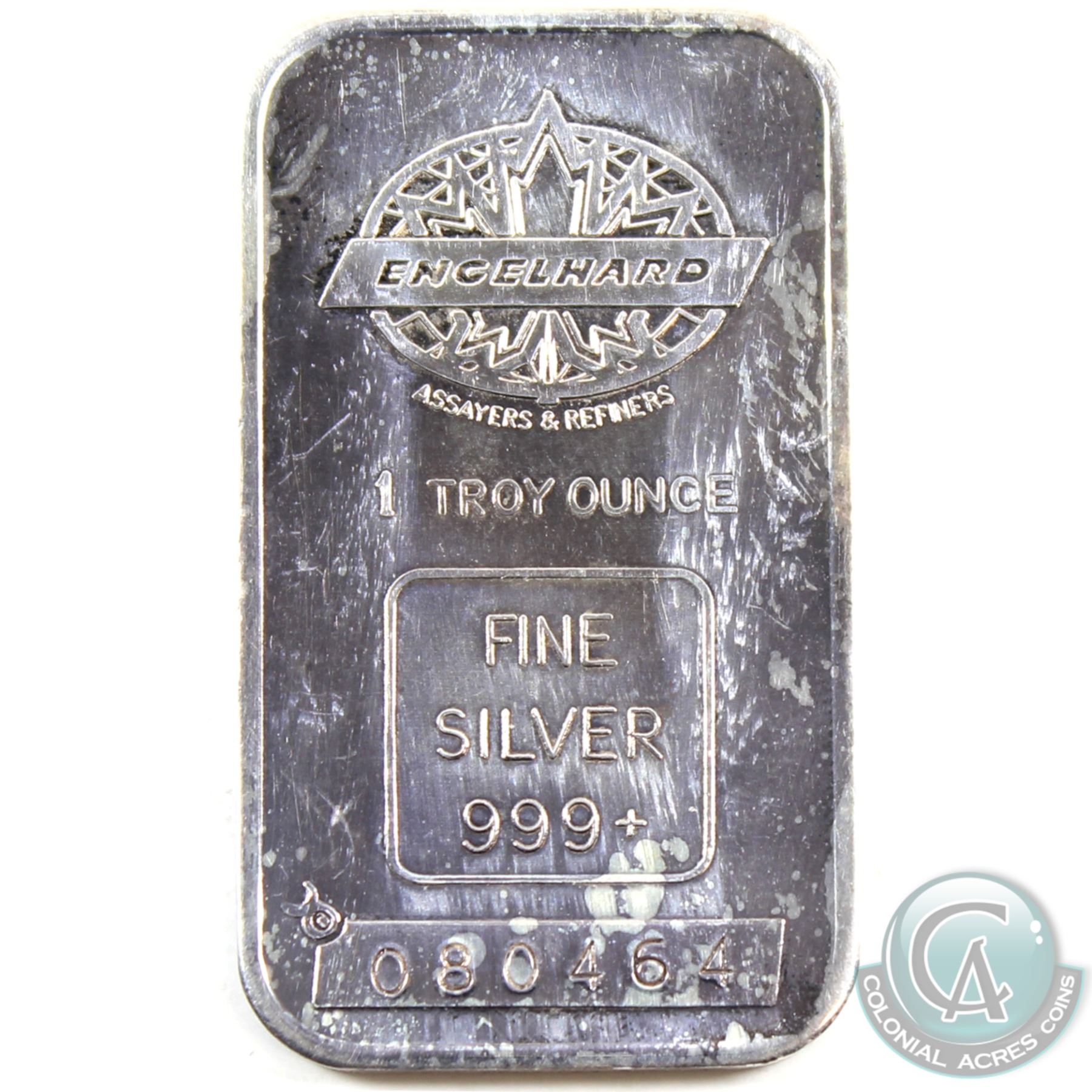 Vintage Engelhard 'Maple Leaf' 1oz Silver Bar with centered Weight Stamp (TAX Exempt). This bar has been engraved on the reverse ' B-G Diamonds & Gold Inc. Serial # 080464.