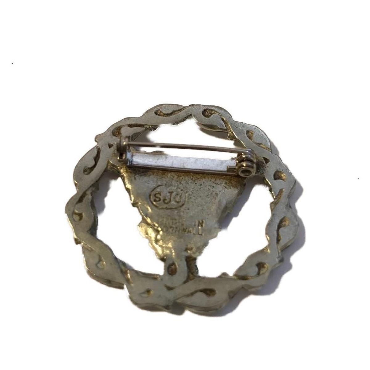 Vintage Saint Justin Cornwall, England pewter jewellery circular brooch with Celtic theme. Stamped "SJC" "Made in Cornwall" on reverse. 1 3/4" D.Â