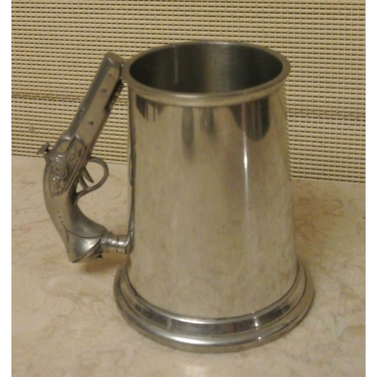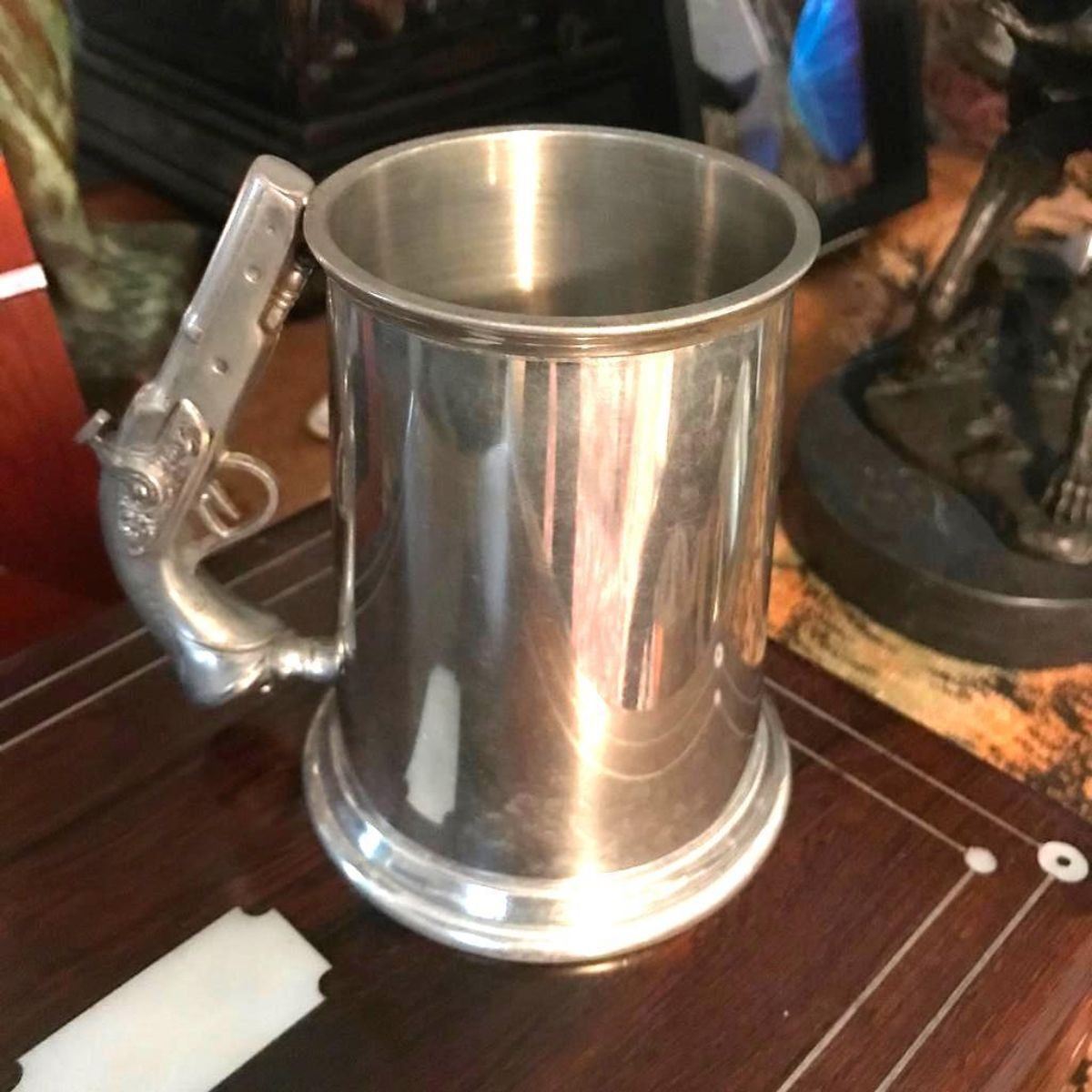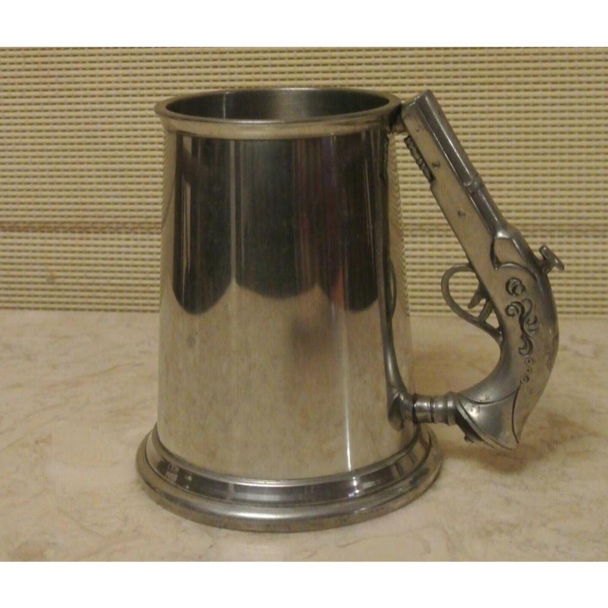 Vintage Sheffield pewter tankard, the handle in the form of a flintlock pistol. Stamped on the bottom. 5" H X 3 1/8" D ( without handle ).