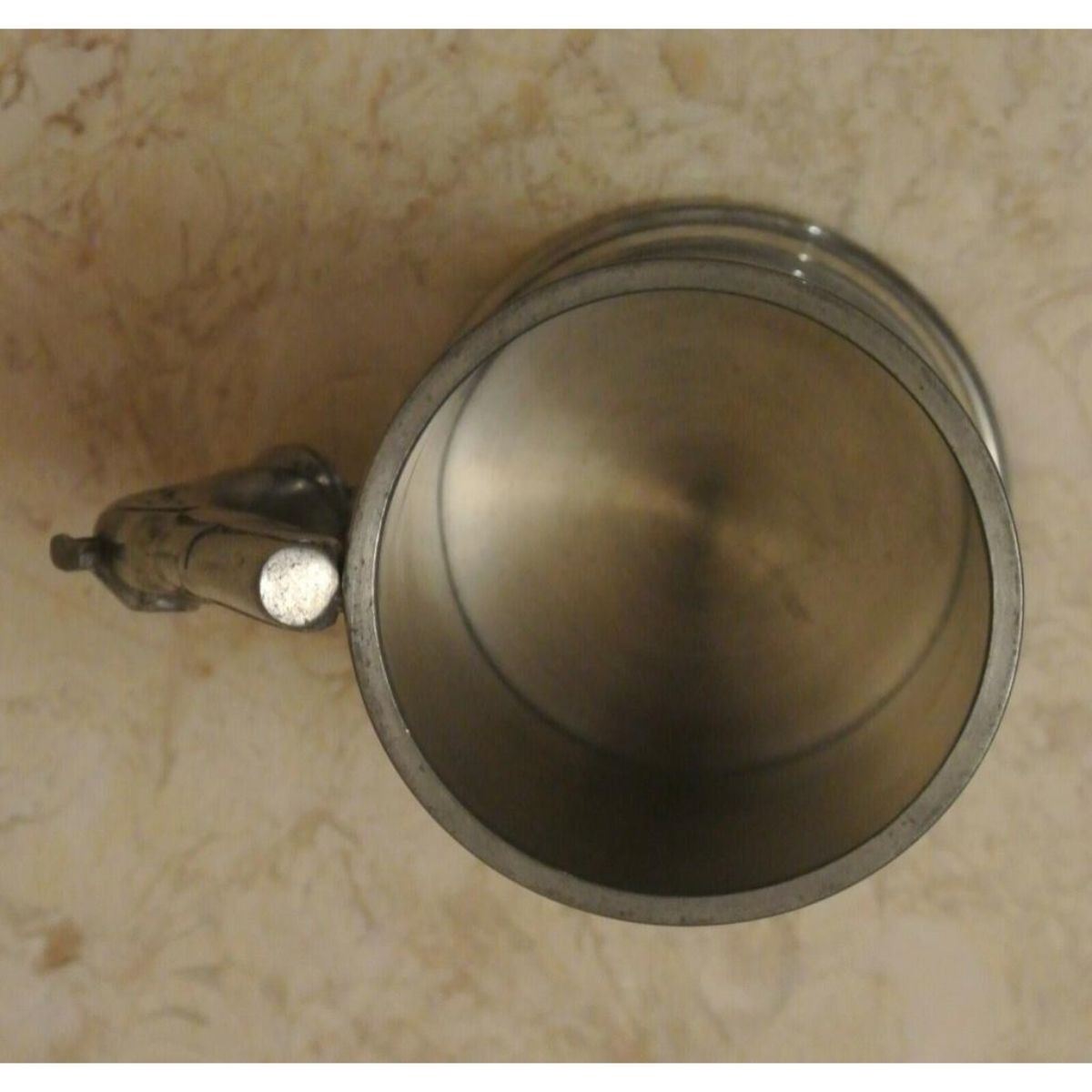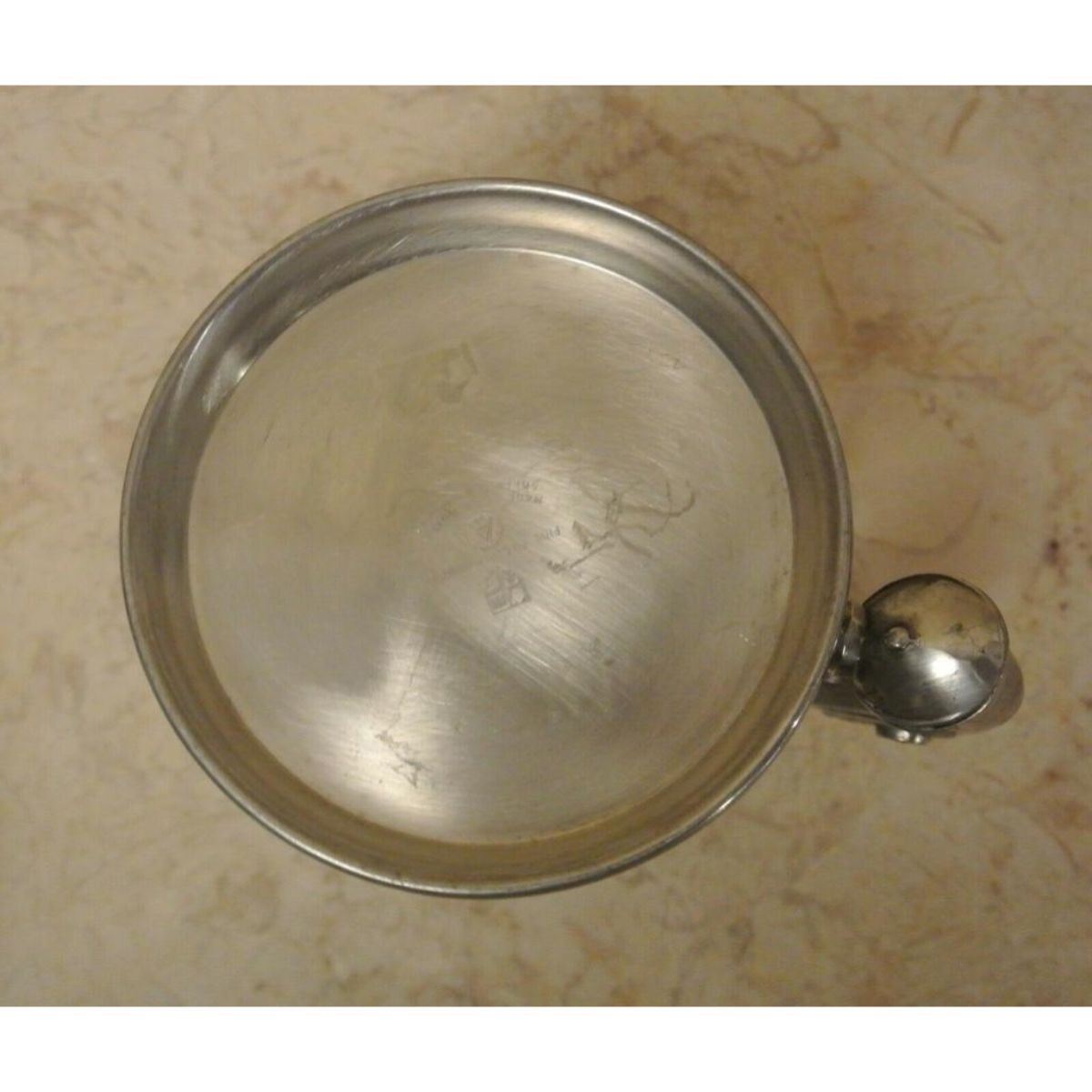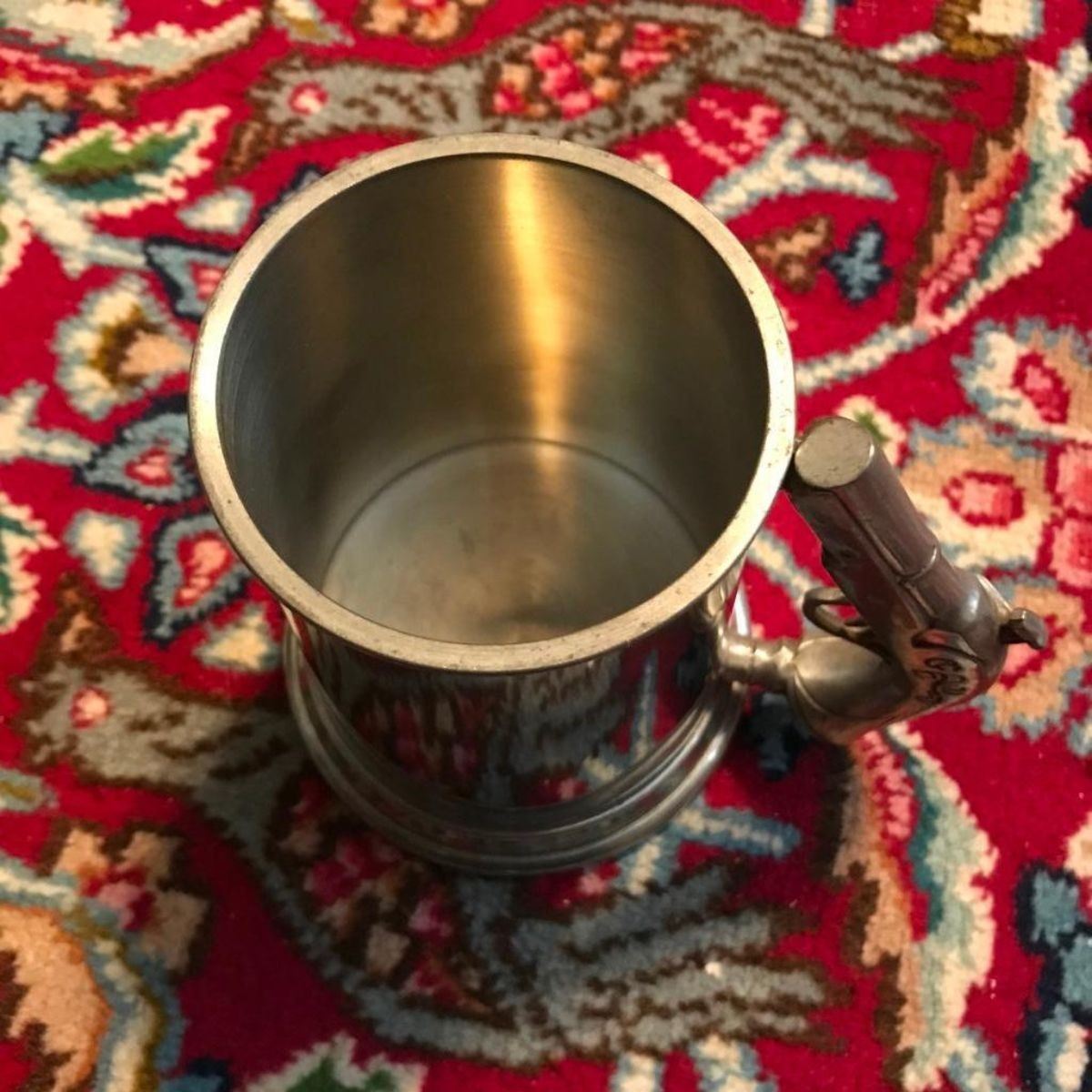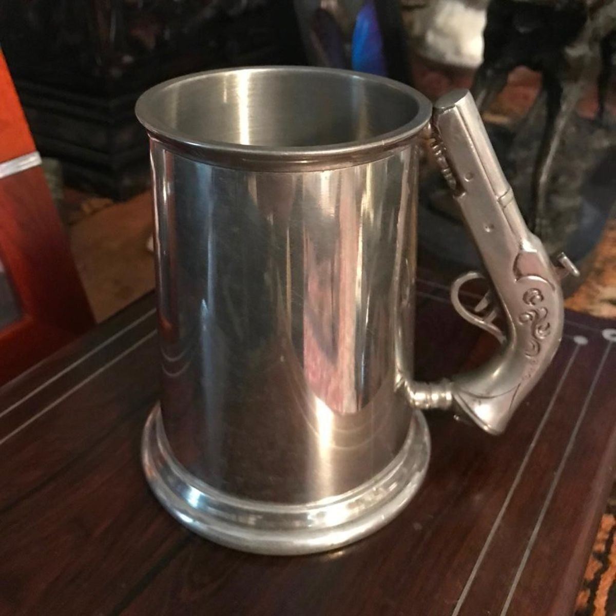 Vintage Sheffield pewter tankard, the handle in the form of a flintlock pistol. Stamped on the bottom. 5" H X 3 1/8" D ( without handle ).