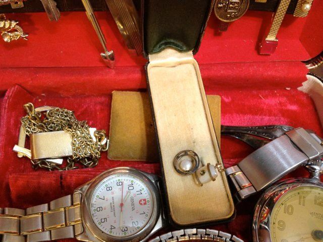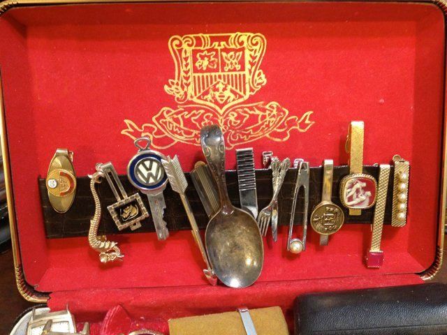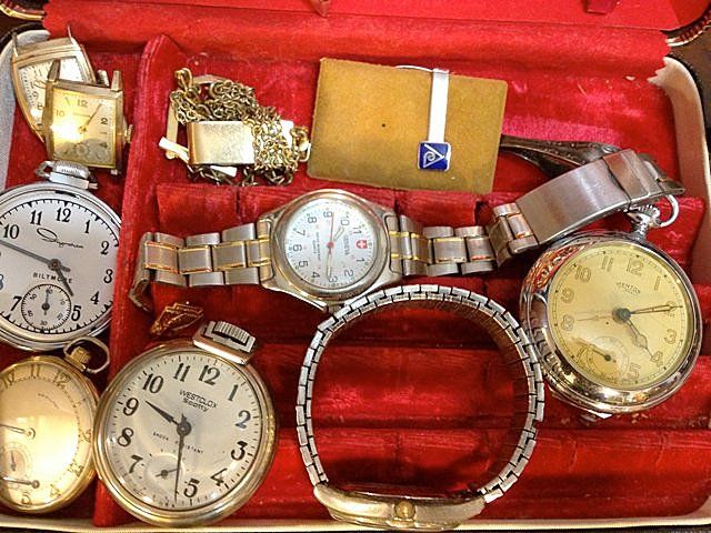 Includes of tie clips, pocket watches, wrist watches, stick pins, watch fob, baby spoon. Hamilton Pocket Watch, made in early 1900's Hamilton Watch Company, Lancaster, PA, 17 Jewel 10 kt gold rolled case. Ingram Watch Company, Bristol, CT Pocket Watch, Bolava Man's Watch, nice estate goodie lot