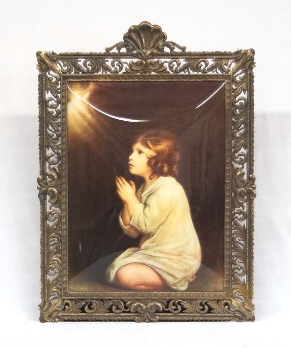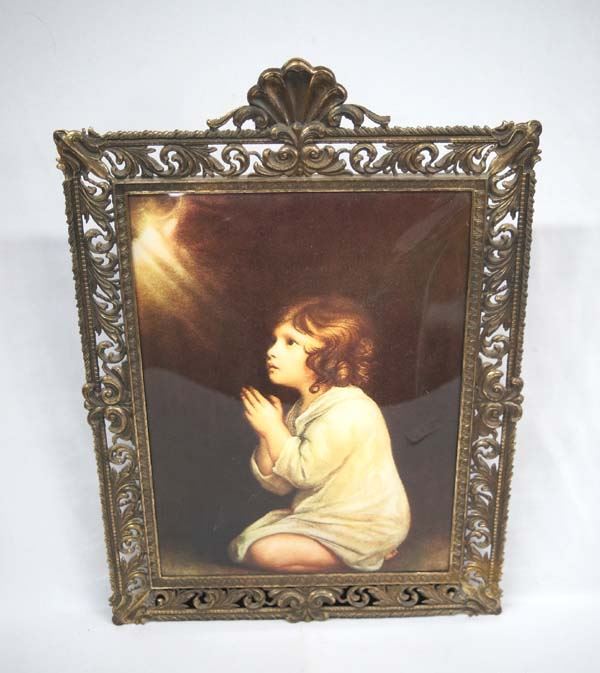 Vintage Estate Praying Child Print, measures 11'' x 15'', gorgeous metal filigree frame, print is under domed glass