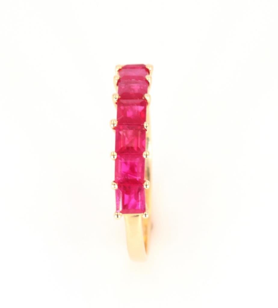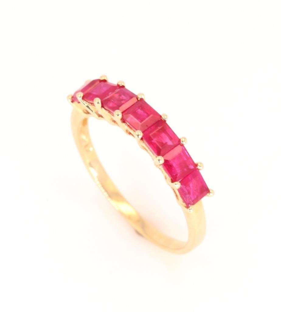 The lot features a wonderful vintage estate ring set with natural Rubies on a 14K gold band. The ring exhibits a total of 7 square step cut Ruby stones with pinkish-red coloring, nice depth and slight inclusions with a total weight of 1.59 carats. The stones are set on a 1.40 gram 14 karat yellow gold polished band in a nice vintage mid-century styling in near mint condition. The ring is a size 6 US.