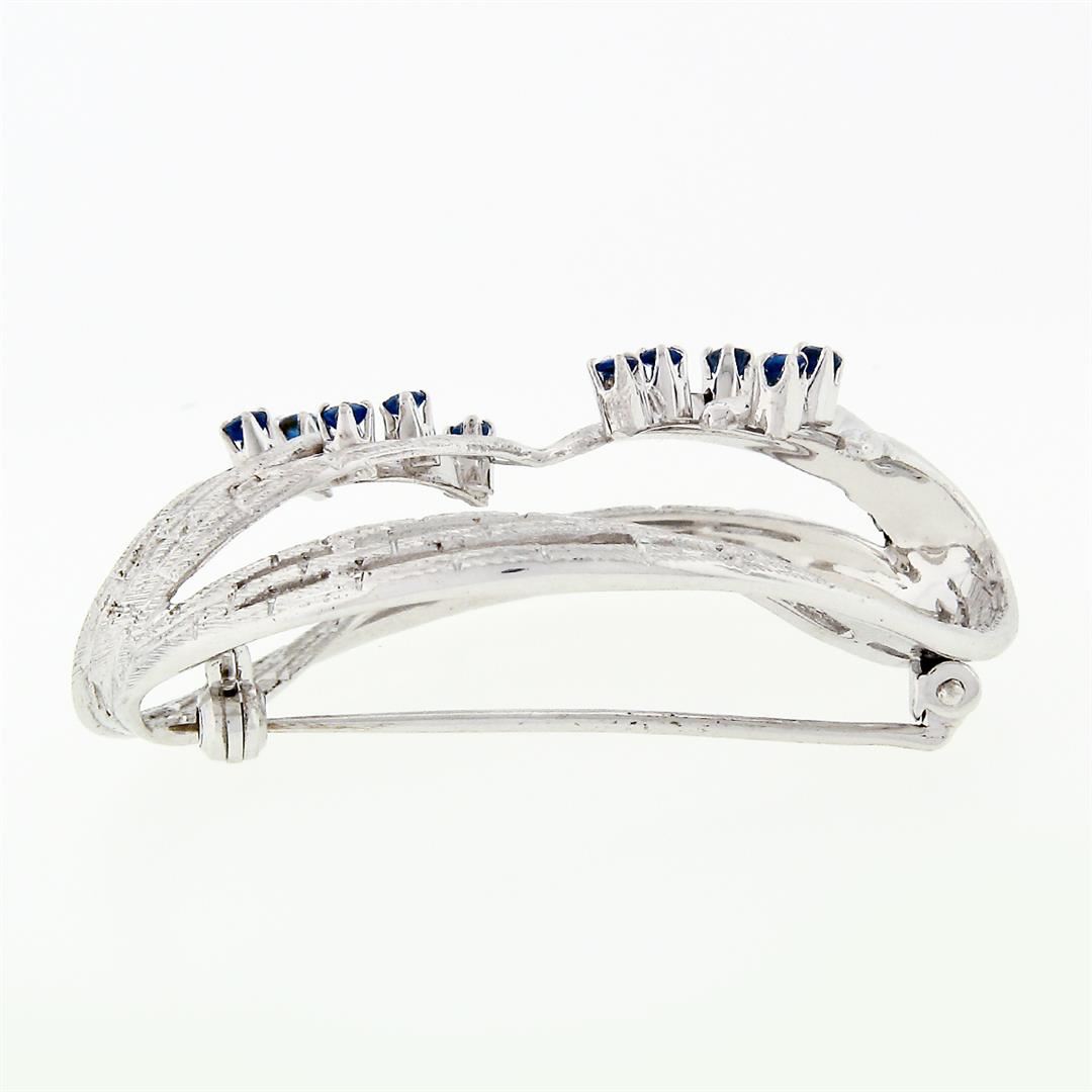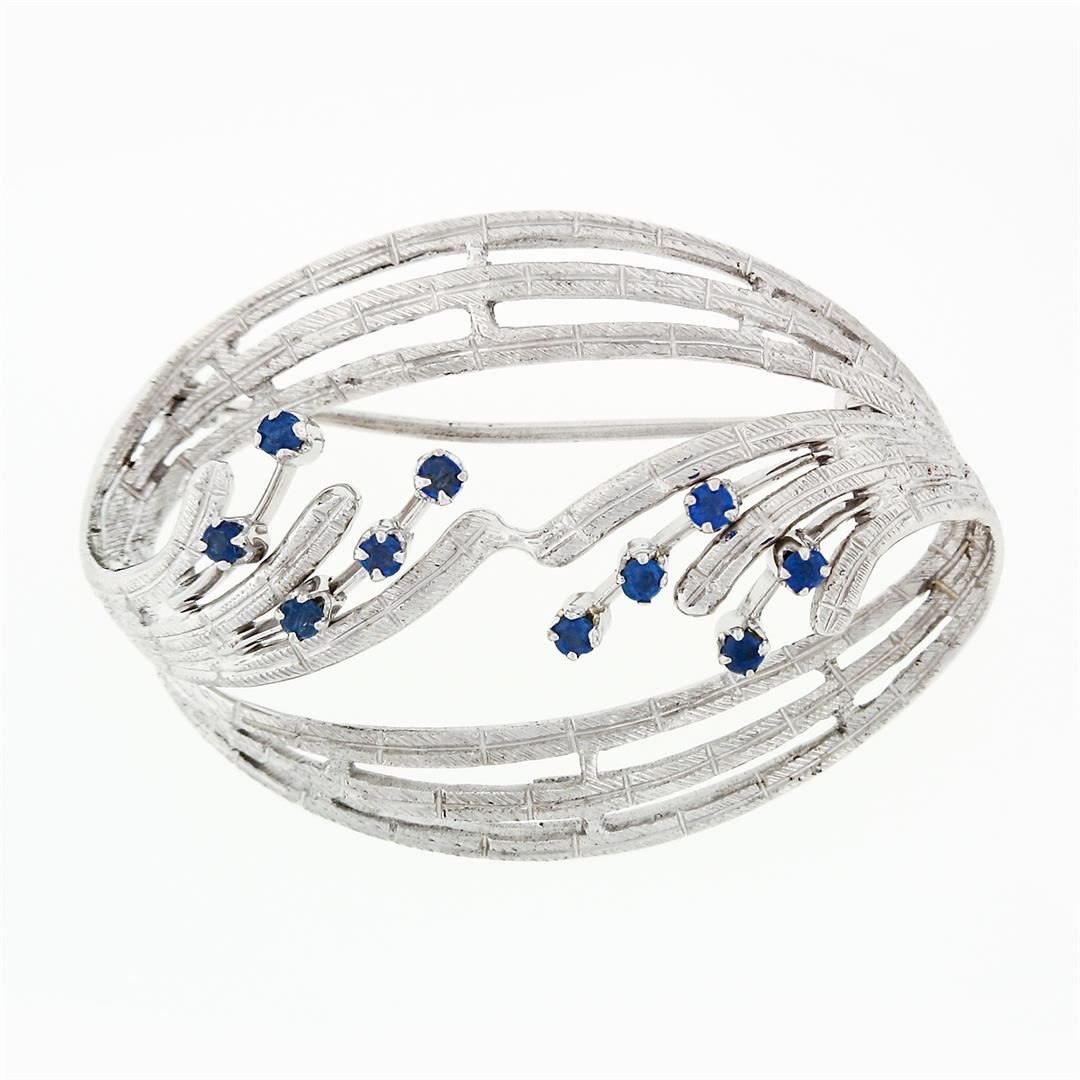 A vintage solid 18k white gold brooch, with 10 round cut natural sapphire (0.30ctw). Measures 28.76x41.04mm and weighs a total of 9.24 grams.