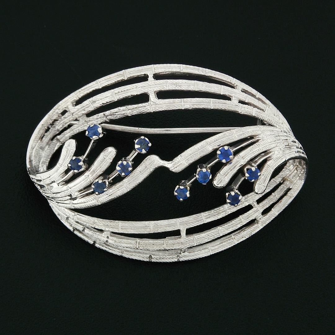 A vintage solid 18k white gold brooch, with 10 round cut natural sapphire (0.30ctw). Measures 28.76x41.04mm and weighs a total of 9.24 grams.
