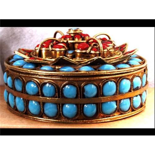 Just look at all the detail on this hand wrought gilt box that has real turquoise and coral in it. Made like a lot of old Czech pieces with the rich hand worked metal and inset stones. This box is by far the largest of this type I have seen. It measures 3 1/2" across and almost 2" tall. The inside has a warm gilding on it and the box has a lot of etruscan work on the top in the form of a flower of some sort. This is in GREAT condition too!