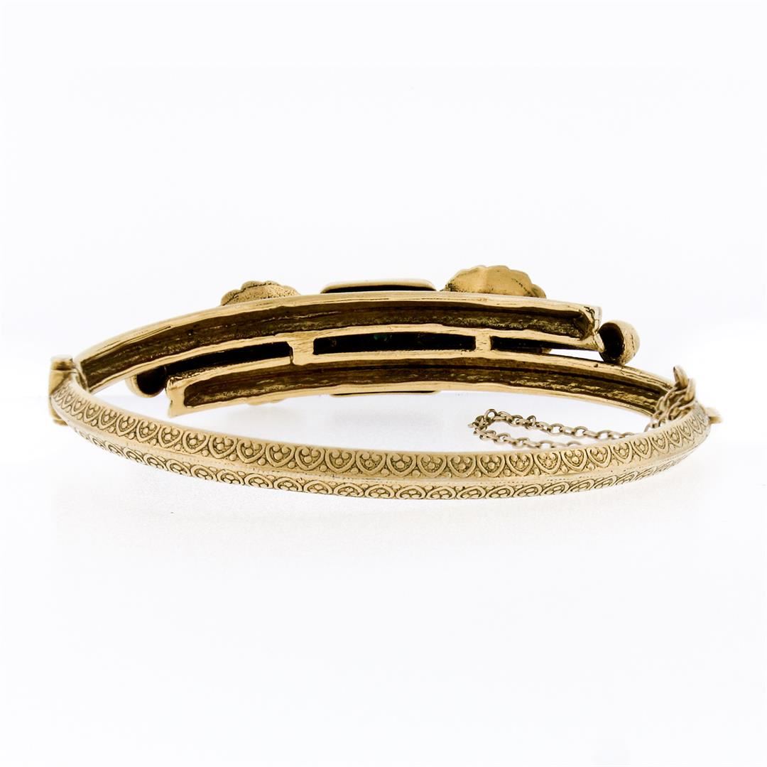 A vintage solid 14k yellow gold bangle bracelet, with 7 round cabochon cut natural persian turquoise (2.50 - 3.0mm). It weighs a total of 20.84 grams, measures 63.75mm wide, and measures 6.5 inches in length.