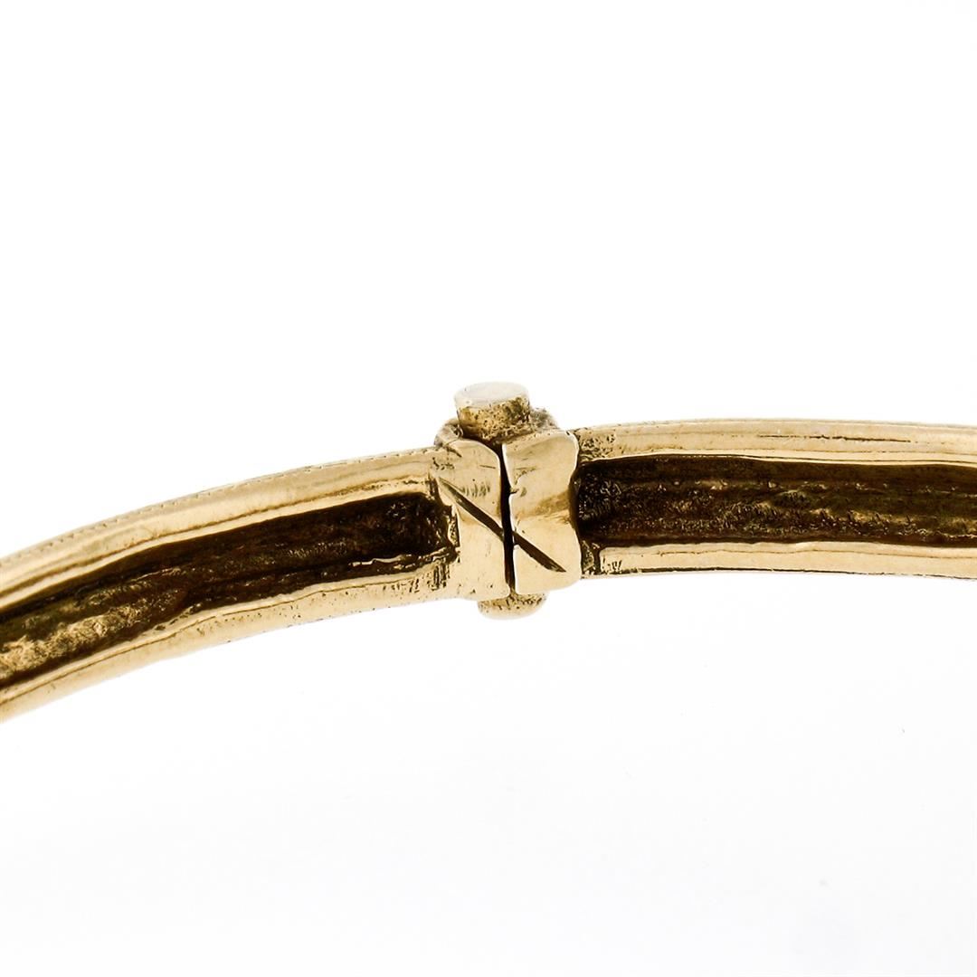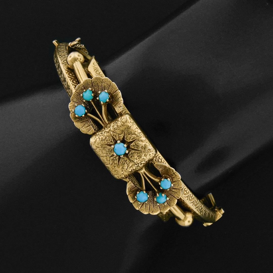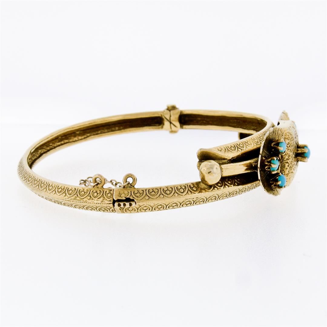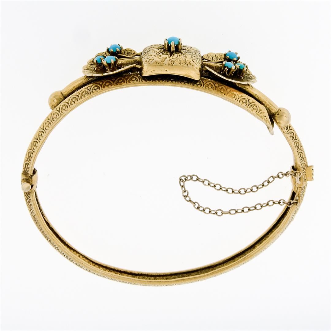 A vintage solid 14k yellow gold bangle bracelet, with 7 round cabochon cut natural persian turquoise (2.50 - 3.0mm). It weighs a total of 20.84 grams, measures 63.75mm wide, and measures 6.5 inches in length.