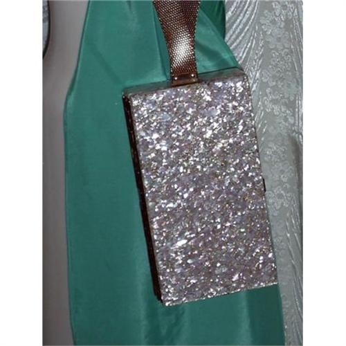 The lucite case is embellished with embedded confetti and gold corkscrews thru out the design. The interior is a gold high shine brass fitted interior. There is a braided gold metal mesh strap to wind around your wrist and cup in your hand as you enter the room with grace and style.