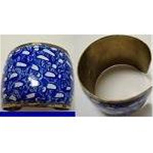 This one just POPS! The bold blue enamel with brush strokes of white has a great gloss; this is a really wide one. Notice the patina beautiful patina on the brass. Adjusts to any size wrist.