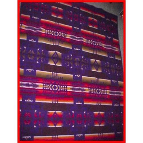 This 69" by 54" Pendleton Wool Mills blanket has a purple background with a brightly striped eyedazzler design. Good condition with some pilling of surface; no holes or rips. I bought this at an estate auction, so no detail information provided.