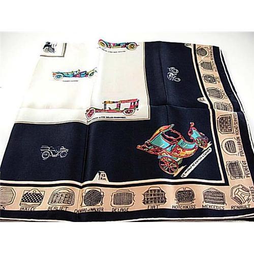 A fabulous vintage French scarf with an antique automobile motif in excellent condition with no rips, tears, or stains noted. It measures 31" by 31" square, has hand rolled and sewn edges, and has multiple types of European cars on it. There are Freres, Peugeot, Fouillaron, Rochet-Schneider, Turgan, Clement, Helbe, DeDietrich, Delaunay-Belleville, Aries, Bollee, Berliet, Chenard et Walker, Delange, Fiat, Hotchkiss, Mercedes, and Renault. There are a lot of other ones in French, so I can't quite make them out. Add this lovely and unusual scarf to your collection!