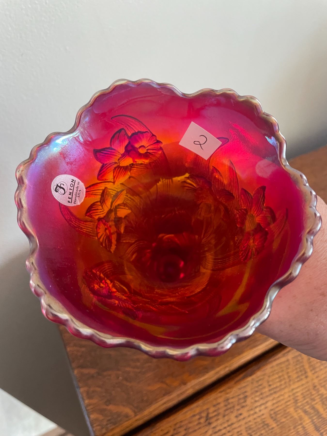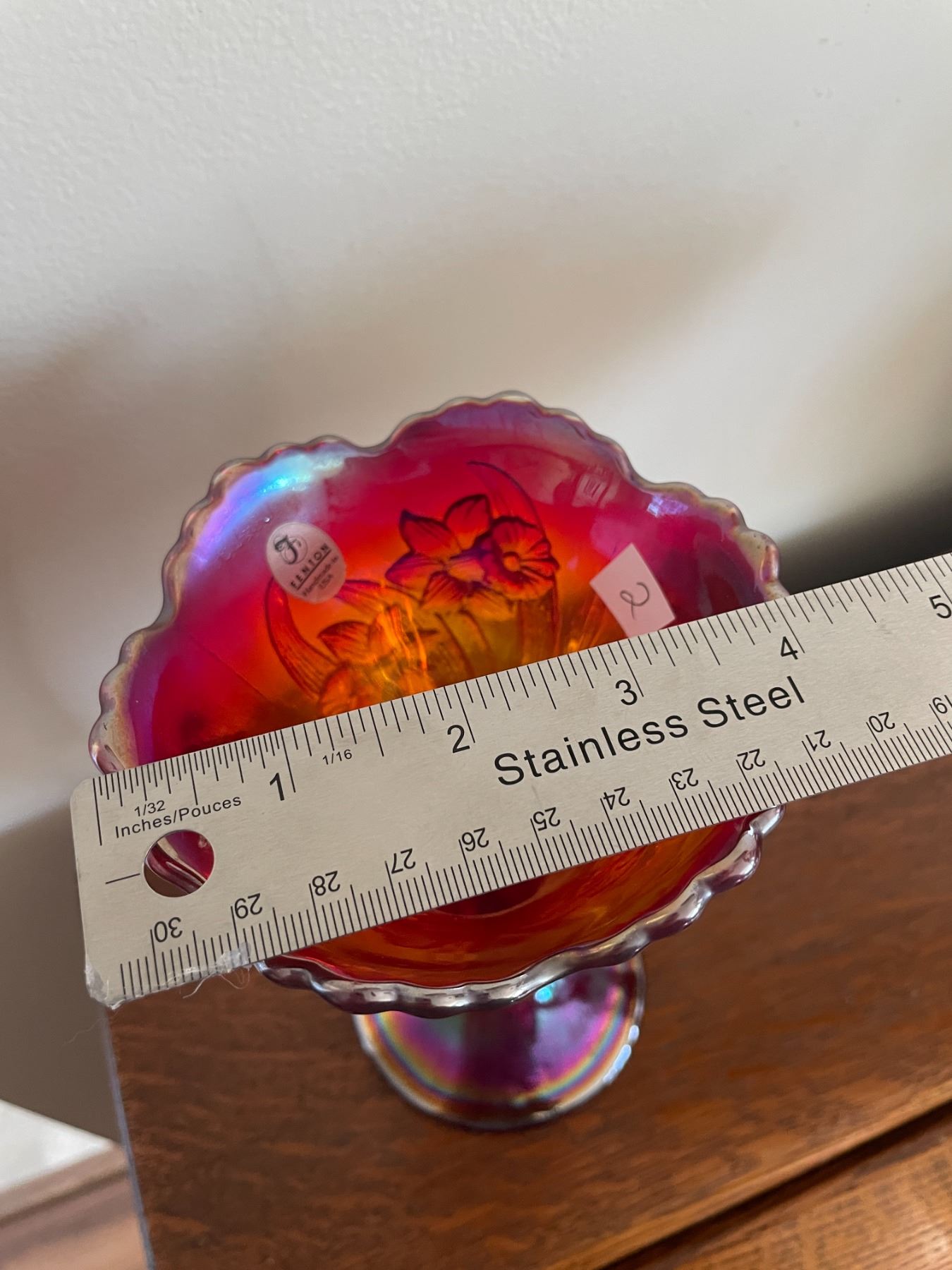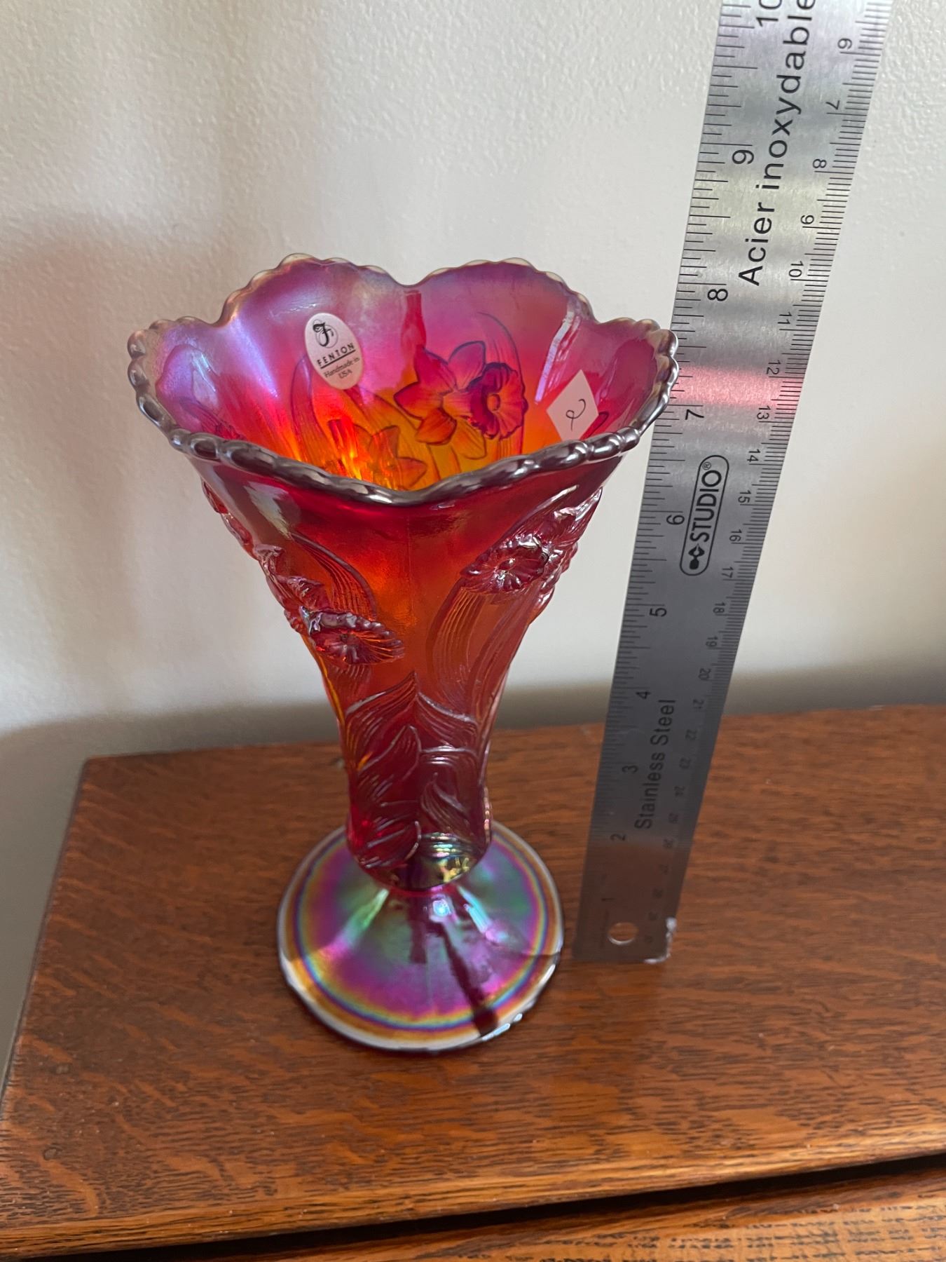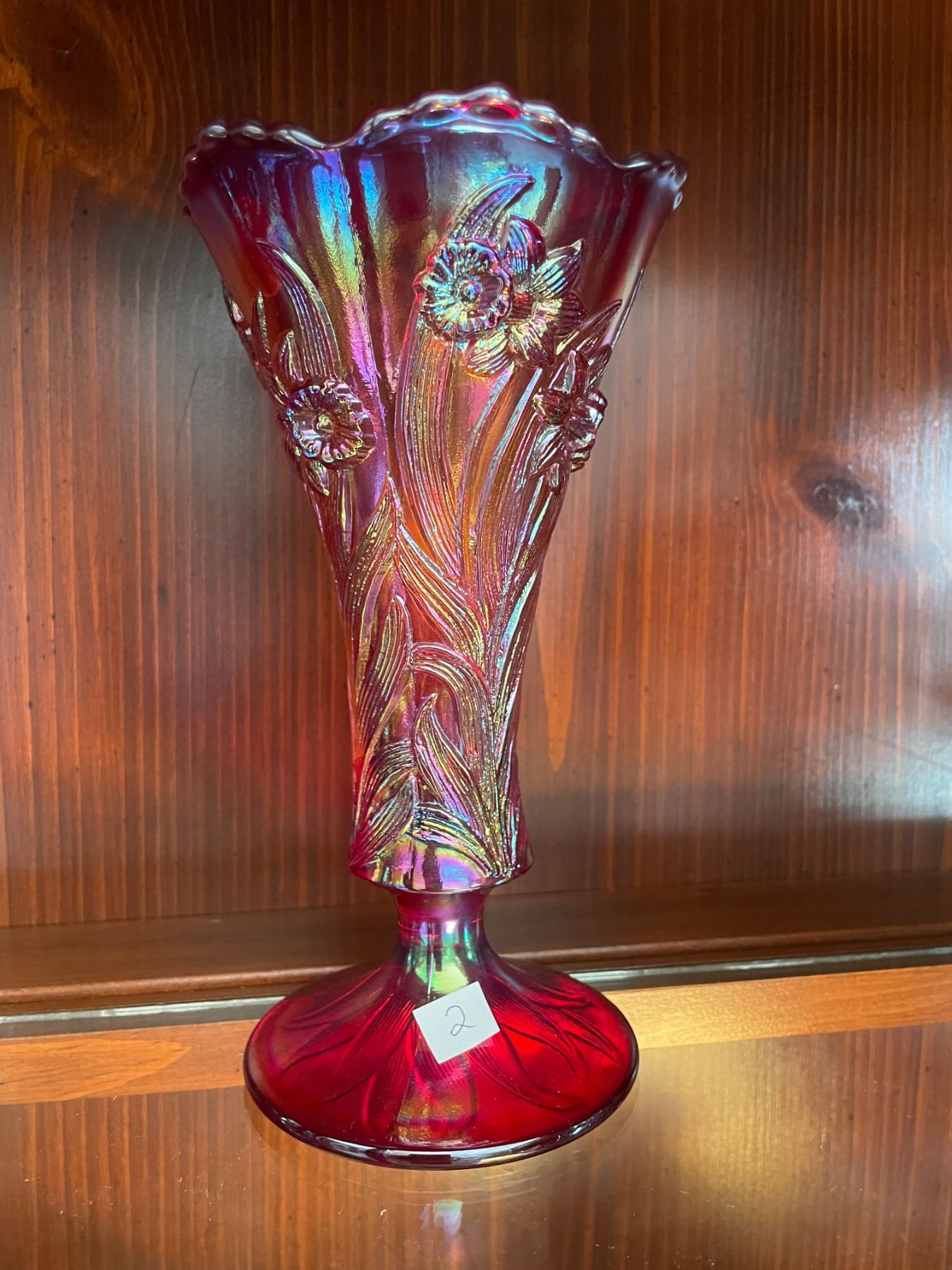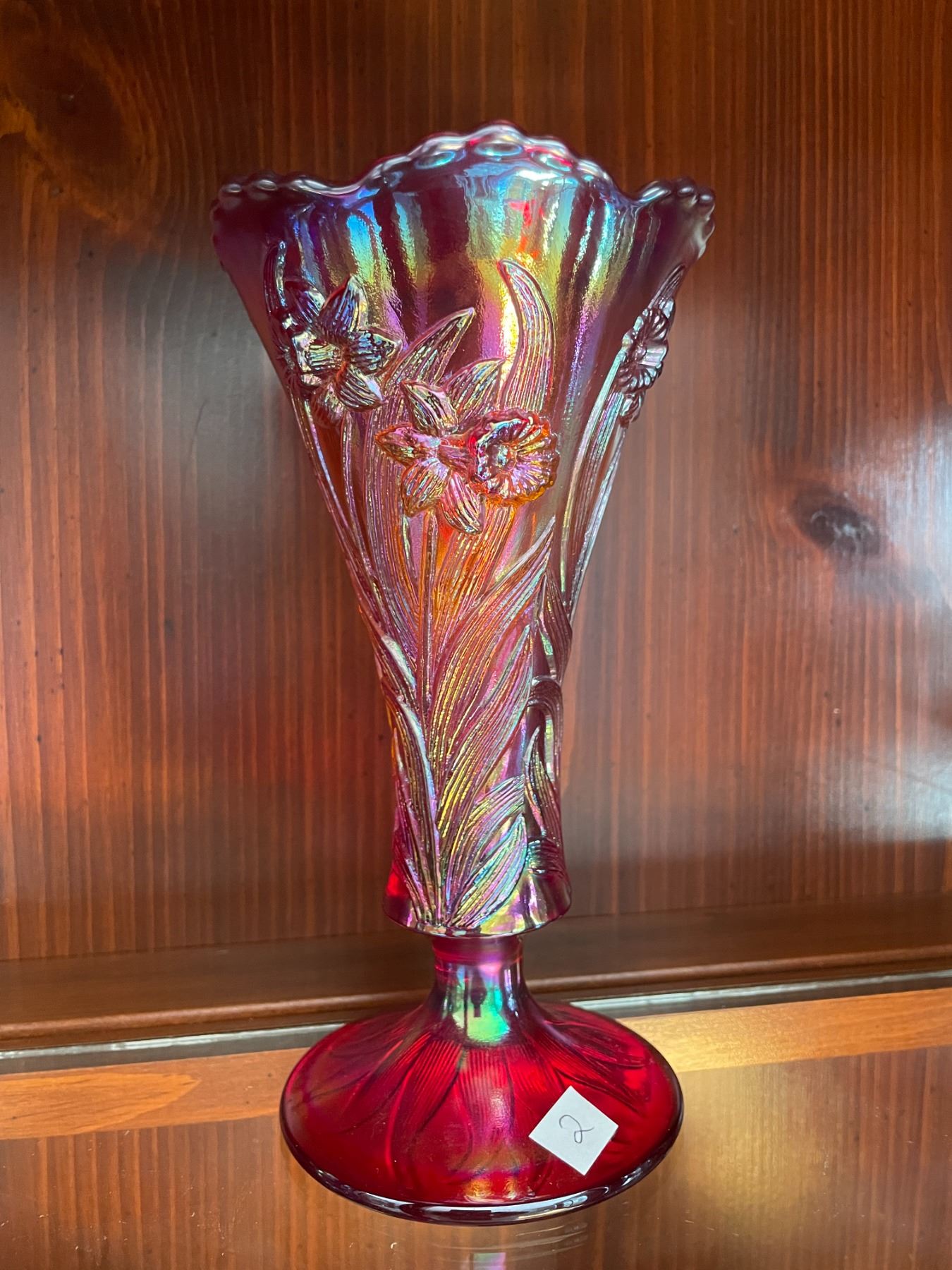 Vintage, Fenton, iridescent, red, carnival glass, vase, with daffodil pattern