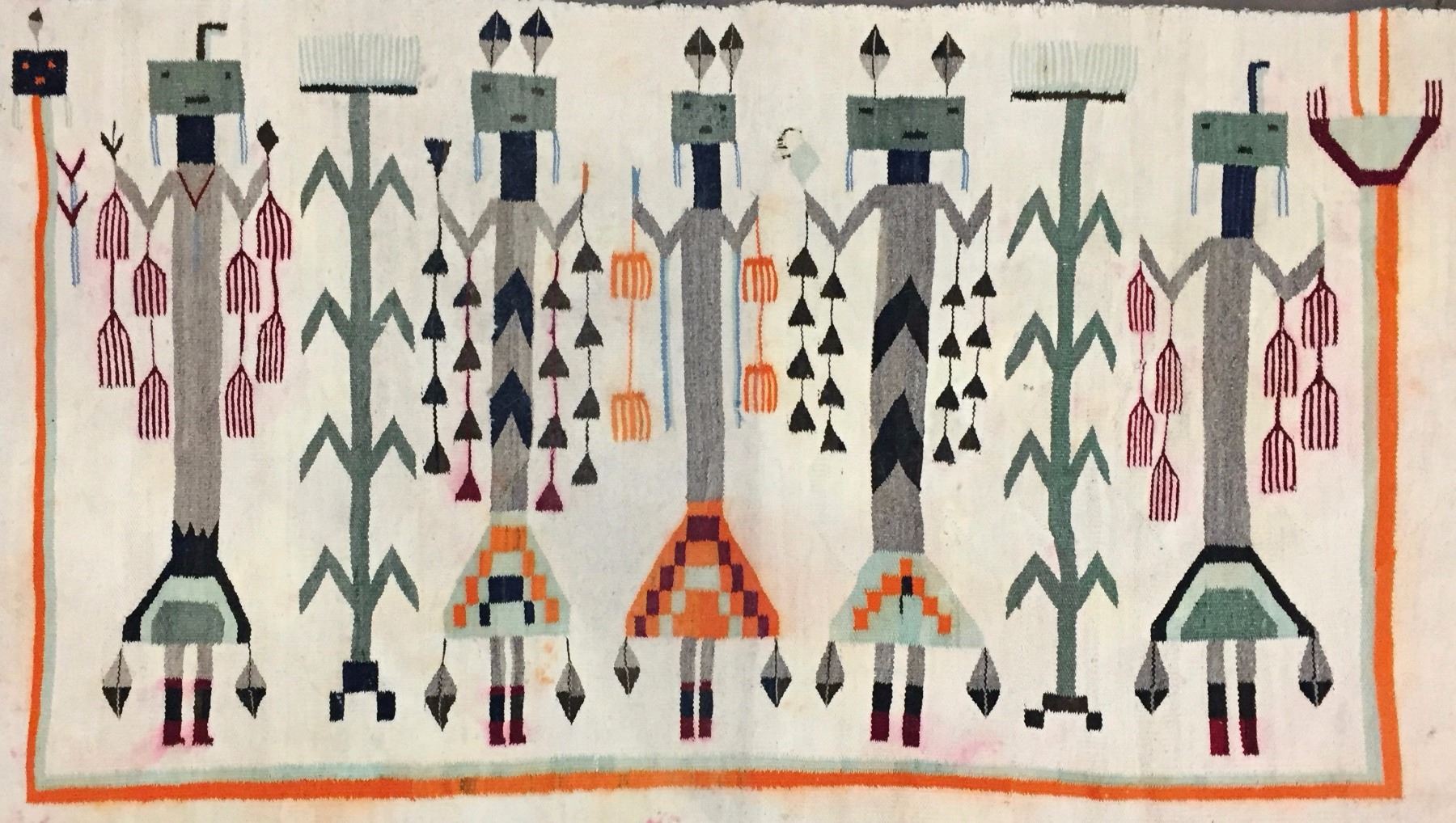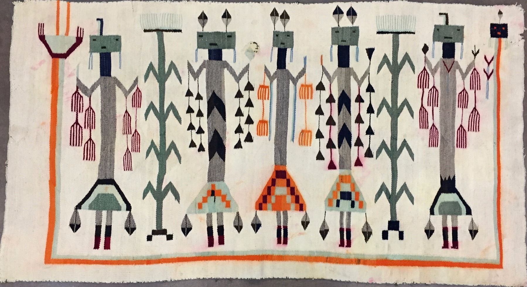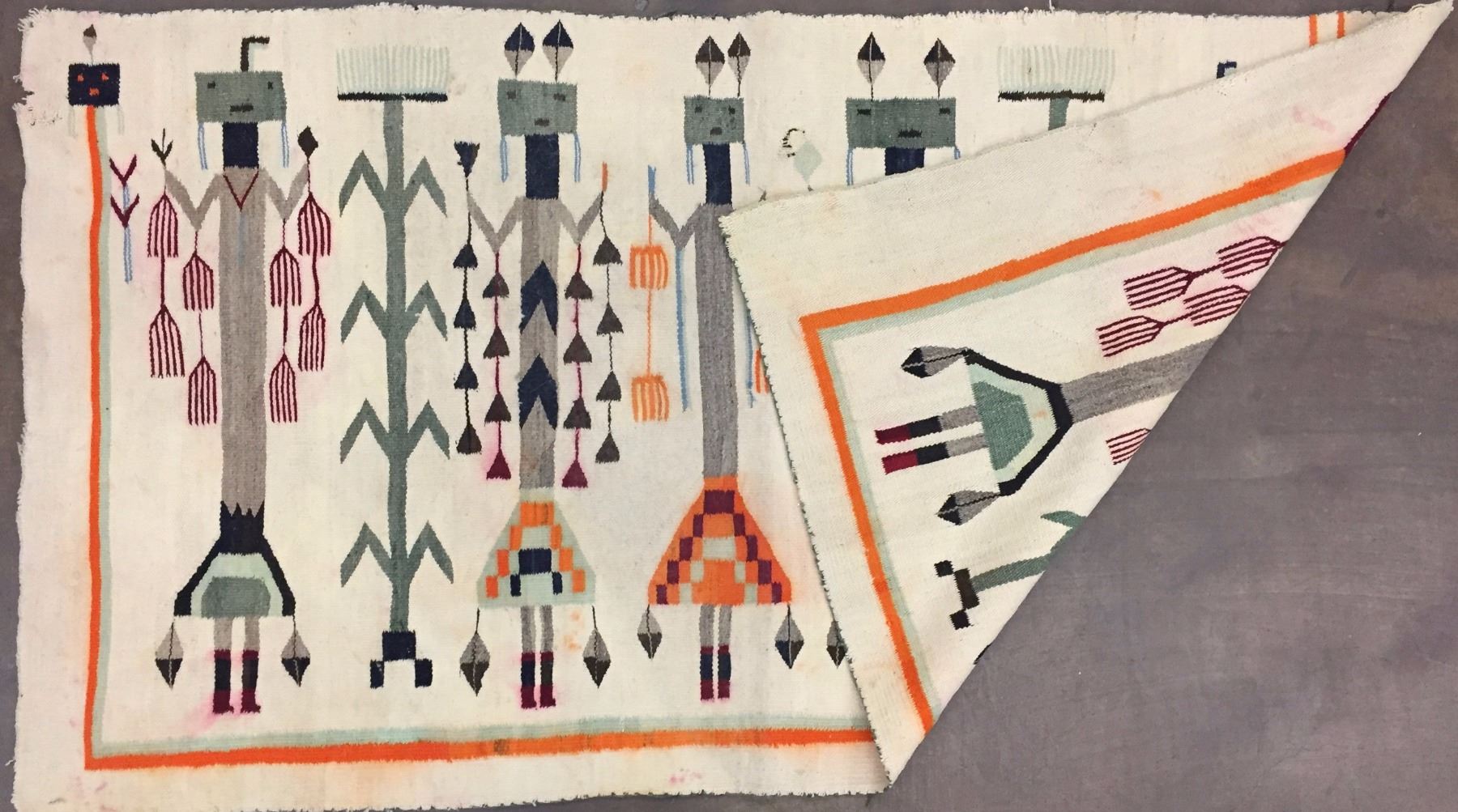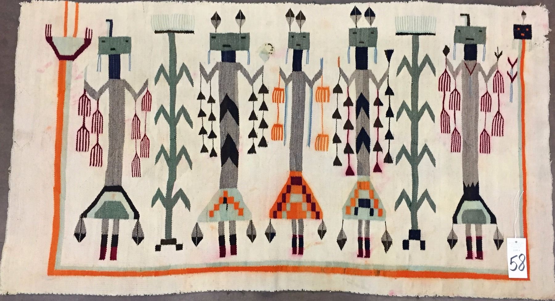 Maker: Unknown Navajo Weaver. Approx. Age: Circa 1950s - 60s. Size: 33” x 60”. Additional Info: An older pictorial. Condition: Poor, has holes, etc. Please look closely at the pictures - they are an important part of our description. Shipping: There will be a $5 handling / packaging fee for shipping this lot. The actual cost of postage will be added on top of that.