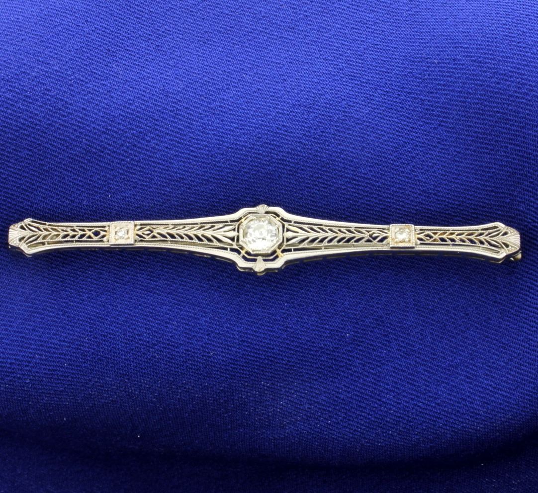 Plated in white gold this pin has a center diamond that is a 1/2ct old mine cut. SI clarity/I color. Also two .03ct diamonds on sides with similar characteristics. 2 7/8 inches long 4.4g
