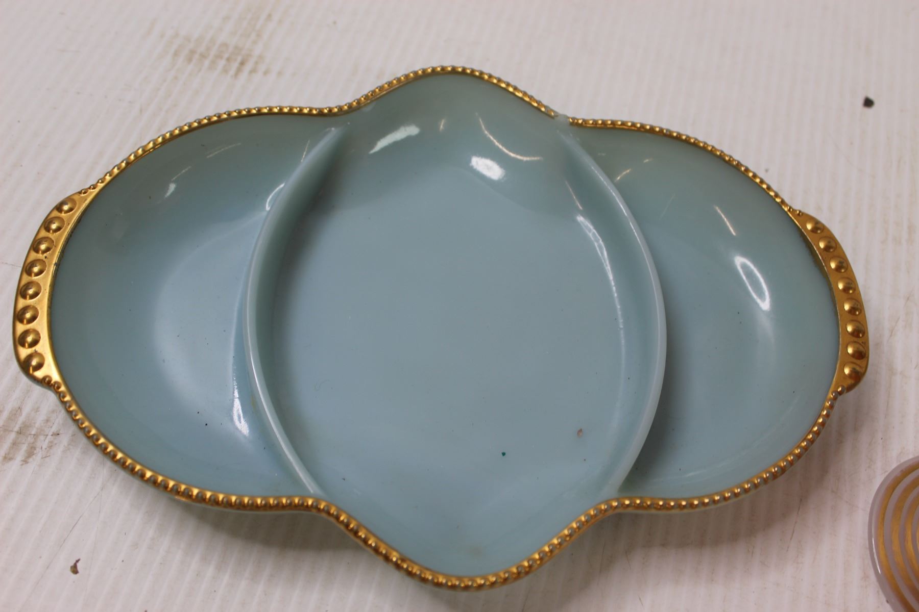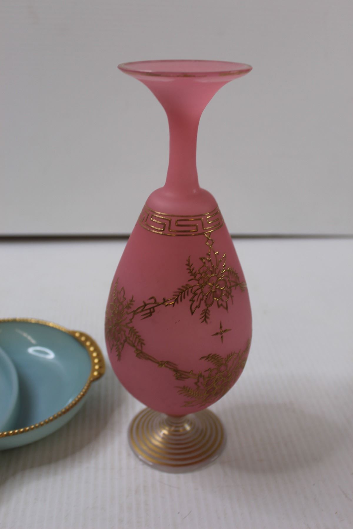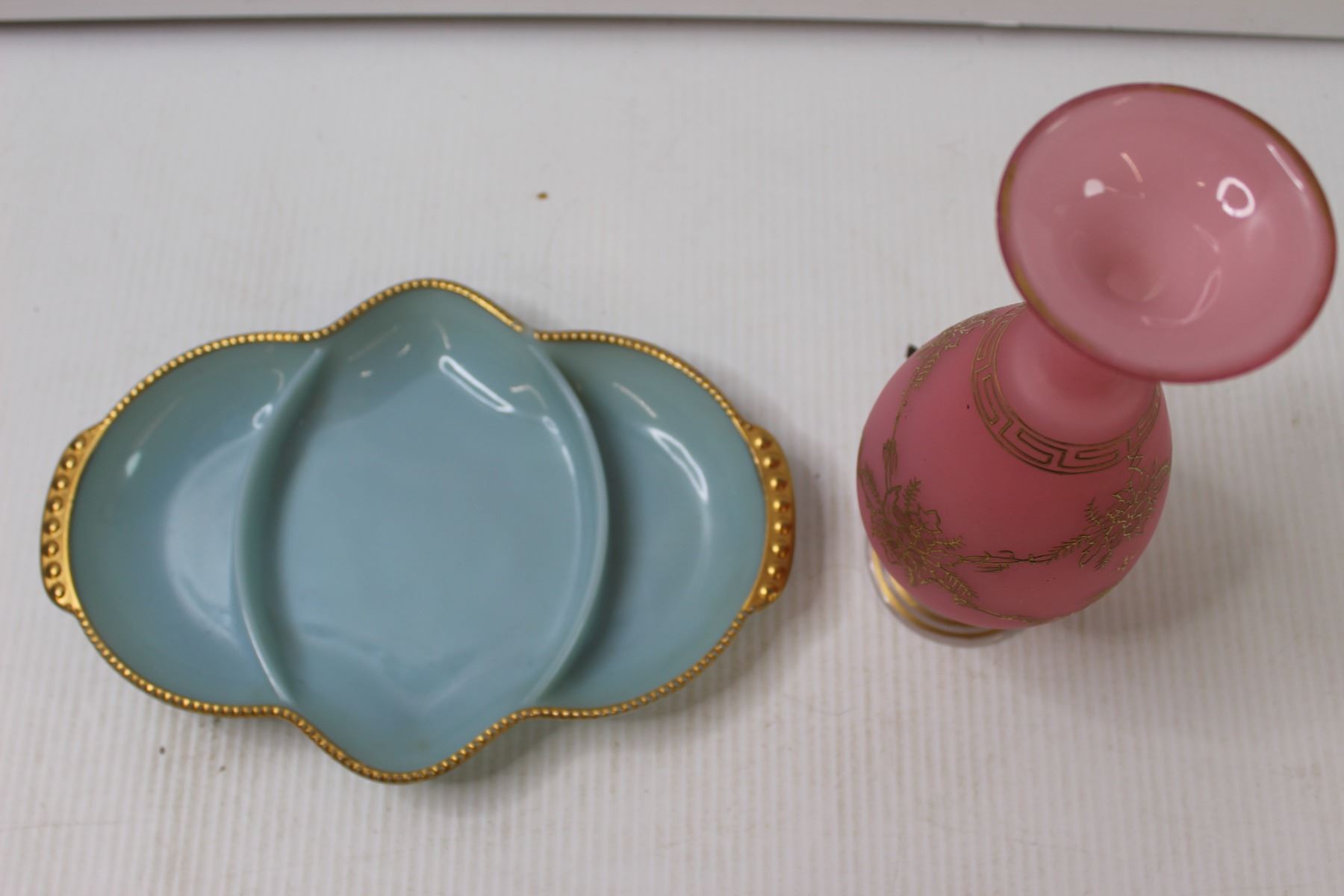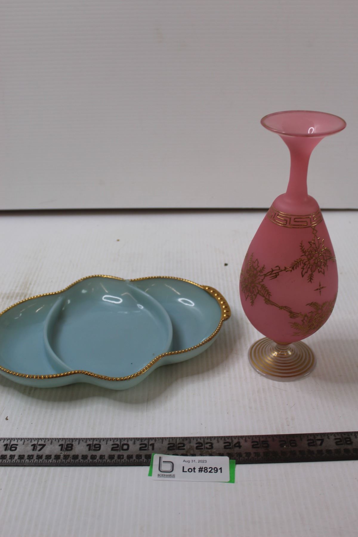 Vintage Fire King Delphite Blue Milk Glass Tray Serving Dish w/Gold Trim MCM and Pink Vase