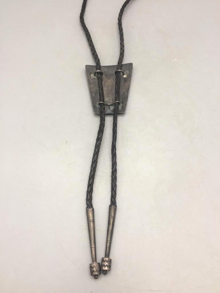 Presented for sale in this lot is a gorgeous fish scale inlay bolo tie. This bolo has a variation of blue/green turquoise (darkening do to age) and has nice tips, all in sterling silver. Maker: Unmarked. Approx. Age: Circa 1960s. Size: Cord measures 36 inches long. Slide measures 2-1/2 inches long. X 2-1/8 inches wide. Weighs 44.5 grams. Condition: Good for its age, normal wear expected. Please look closely at the pictures - they are an important part of our description. Shipping: There will be a $5 handling / packaging fee for shipping this lot. The actual cost of postage will be added on top of that. BUY IT NOW: If you would like to buy this item now without waiting for the auction to end (this option is only available up to 48 hours before the auction starts to close), the “Buy it Now” price is the high estimate of this lot. If you would like to end the auction early and pay the high estimate (plus applicable fees), please contact us by phone or email and reference this lot number.