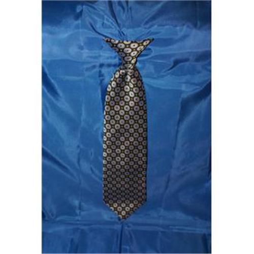 This clip-on tie has a fish-eye pattern with a mixture of silver, yellow and forest green.