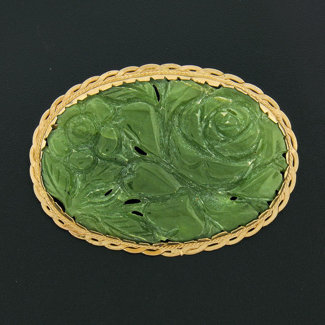 A vintage solid 12k yellow gold frame brooch pendant, with 1 carved natural jade (45.4x30mm). Measures 36x50.2mm and weighs a total of 12.79 grams, and bail diameter inside 4.7mm.