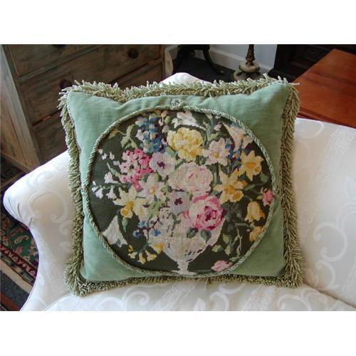 Absolutely gorgeous designer pillow! This and 2 others I will be listing are all made with VINTAGE needlepoints and come from a designer's home. The pillows were made with extremely expensive trim and fabric. All are velvet with the needlepoint in the center. These are down pillows! Smoke free environment and in excellent condition. The primary color on this pillow is Seafoam Green velvet with colorful florals in the needlepoint. Measures a generous 21" x 21".