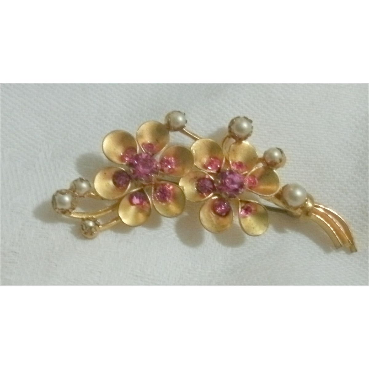 Lovely Vintage Pin. Goldtone with pink Rhinestones/Crystals and faux pearls. Working clasp. Marked Made In Czech..See pictures for details and condition.