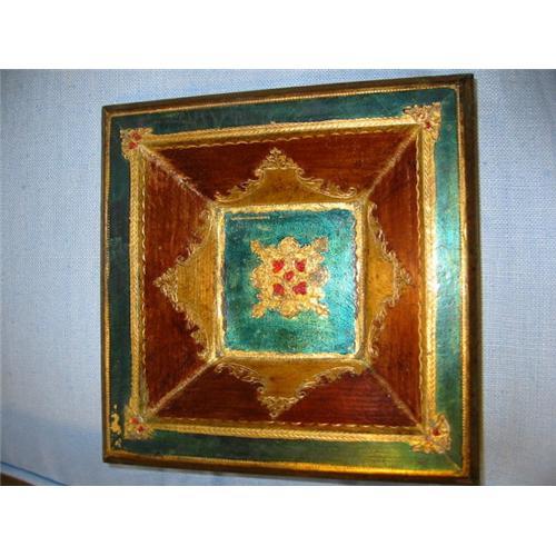 exquisite, Florentine - made in Italy stamped on the bottom. green felt on the bottom. colors are stunning. vintage and in excellent condition, normal wear and tear. square shape and its height measures approximately 1.5 inches, 7.5 inches wide and depth is 6 inches. it is decorative and collectible. gorgious and would make a wonderful and nice desk accessory. nice dish or display. colors are gold - green and bronze. perfect in every sense.