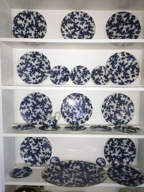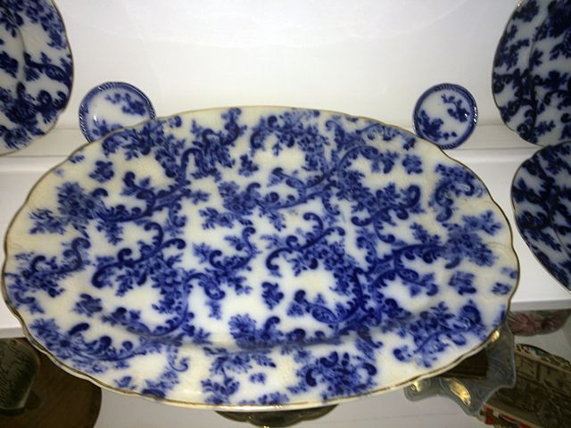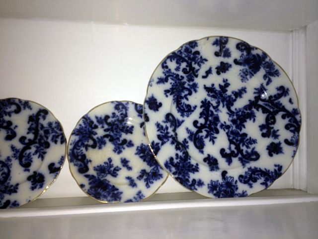 Vintage Flown Blue Plates; Paisley Pattern with gold rim by Mercer, approx. 24 matching pieces.