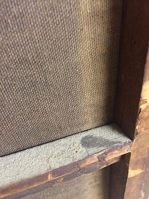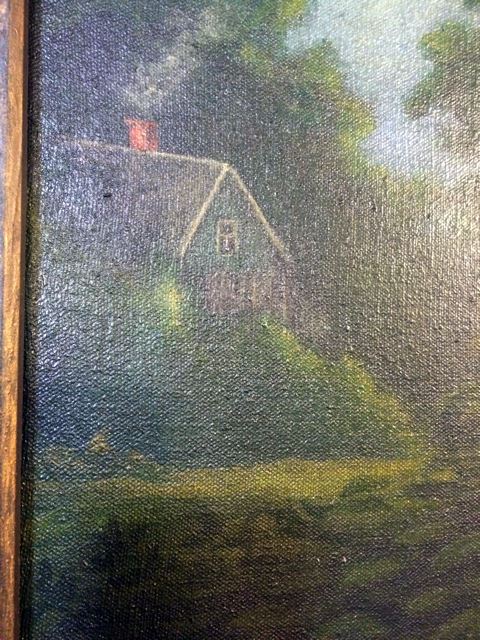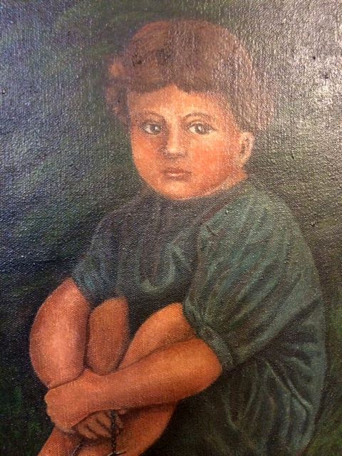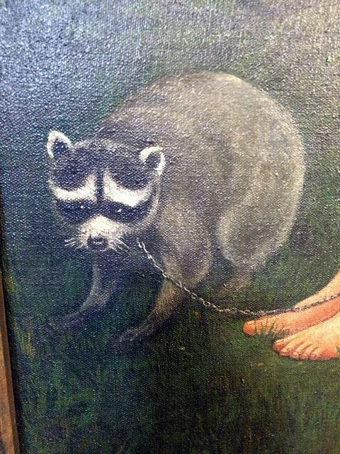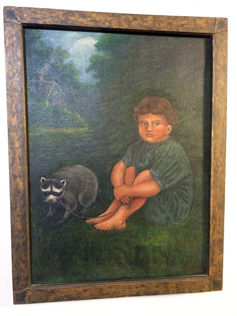 Vintage folk art painting on canvas, vintage wooden frame with nice corner work. Very unusual folk art painting of boy with pet raccoon. Dated 1913 on back, signed, beautiful original frame with original dust straight from Washington, CT estate!