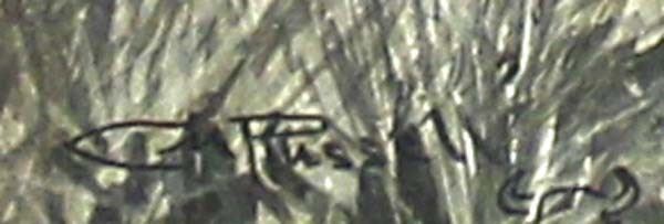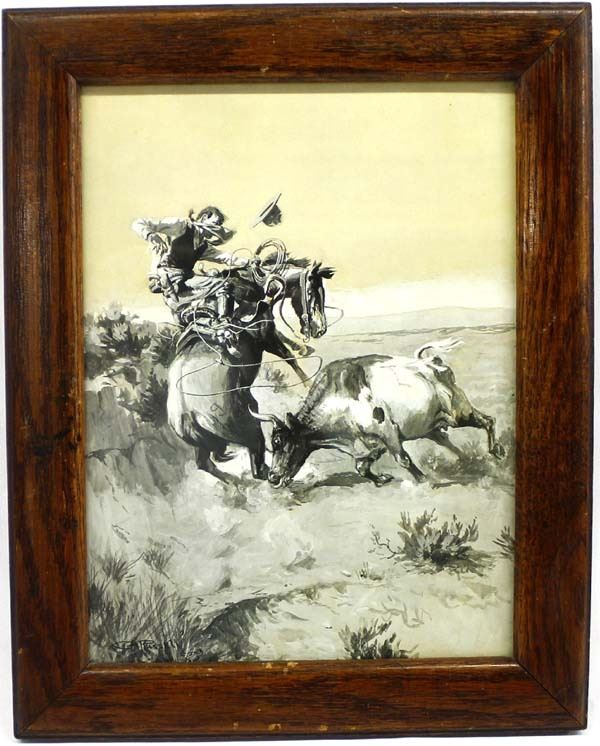Antique/Vintage Framed Charles M. Russell Print, visual measures 9'' x 11'', inside of a very old wood backed frame, total measurement of 14.5'' x 12''
