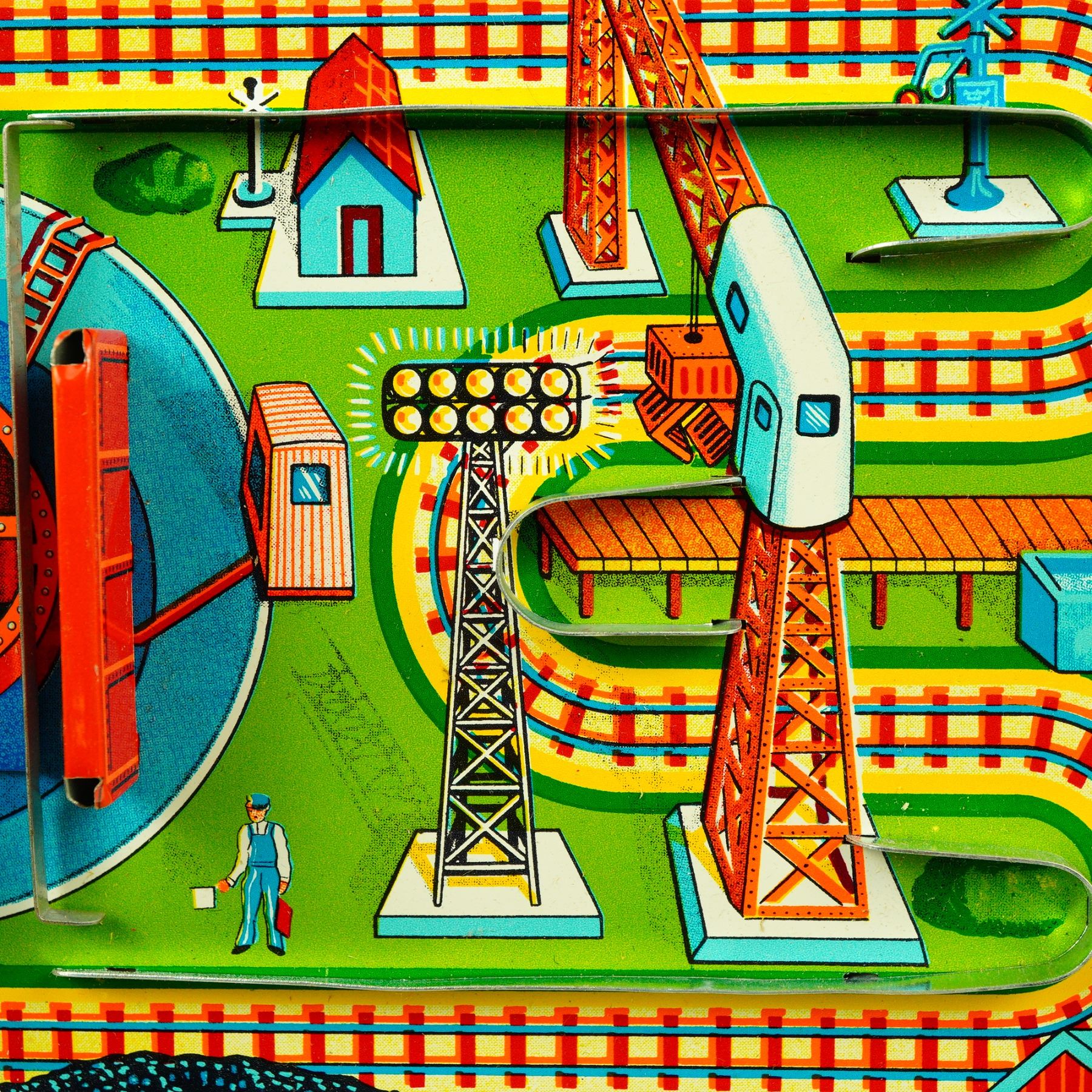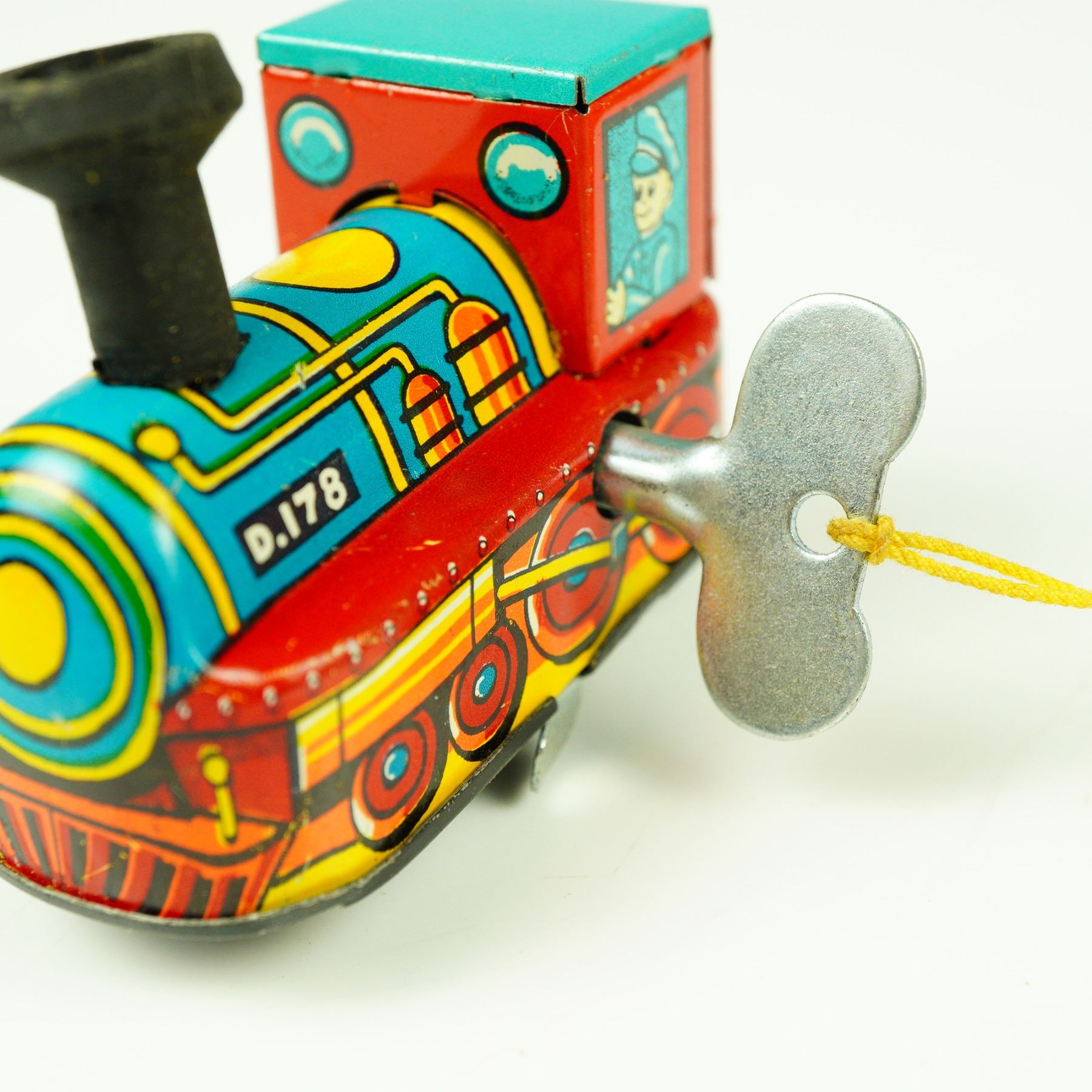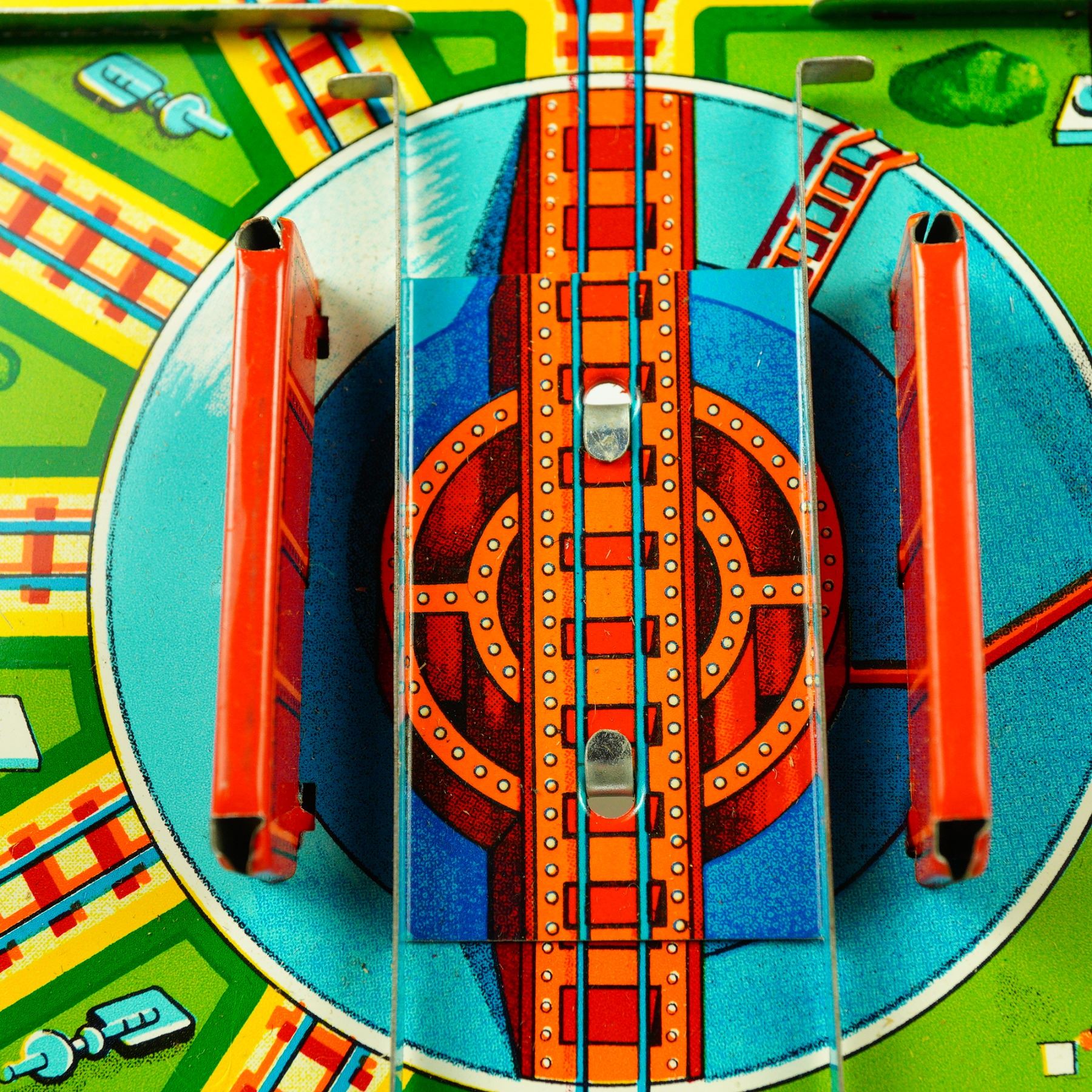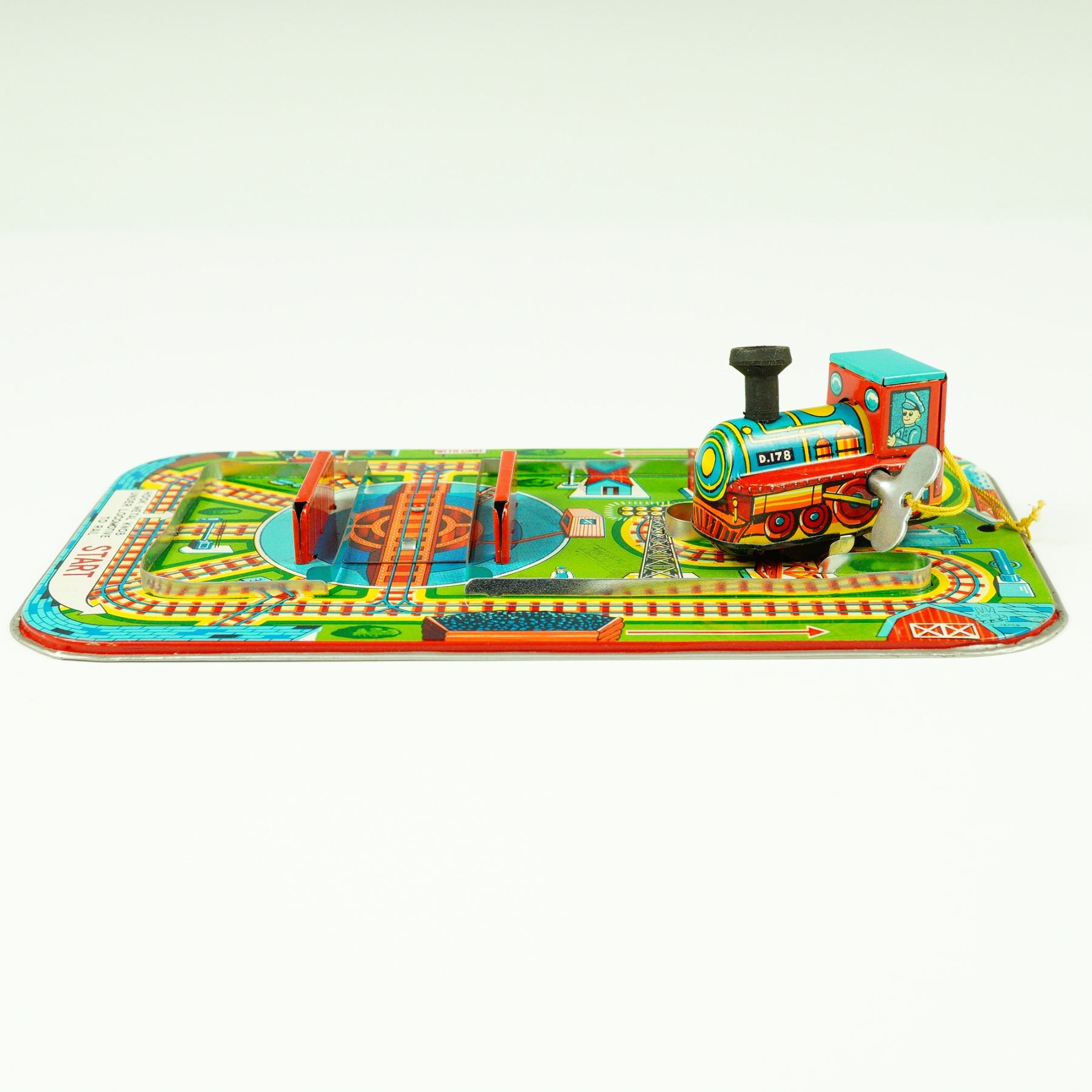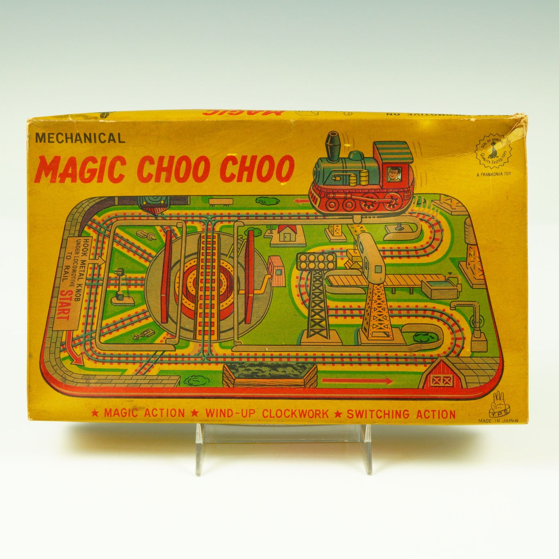 This delightful vintage "Magic Choo Choo" wind-up tin train set by Frankonia, made in Japan, is a wonderful example of mid-20th century toy craftsmanship. The brightly lithographed tin features a colorful track board with switching action and charming illustrations, paired with a detailed wind-up locomotive marked D.178. The train, equipped with its original key, operates via classic clockwork mechanics, designed to run smoothly along the printed track layout. The set comes with its original illustrated box, boldly labeled "Mechanical Magic Choo Choo - Magic Action - Wind-Up Clockwork - Switching Action." The graphics on both the toy and the box exhibit vivid primary colors and clean retro design, making it a standout collectible for any tin toy or railway enthusiast. This example remains in good vintage condition, showing only minor wear consistent with age and gentle use. The graphics are vibrant, and the metal retains a bright, clean finish. Having the original box makes this set even more desirable to collectors, particularly those specializing in Japanese post-war tin toys or the Frankonia brand. A charming and functional piece of toy history, perfect for display or for adding nostalgic character to any collection of mechanical tin toys.