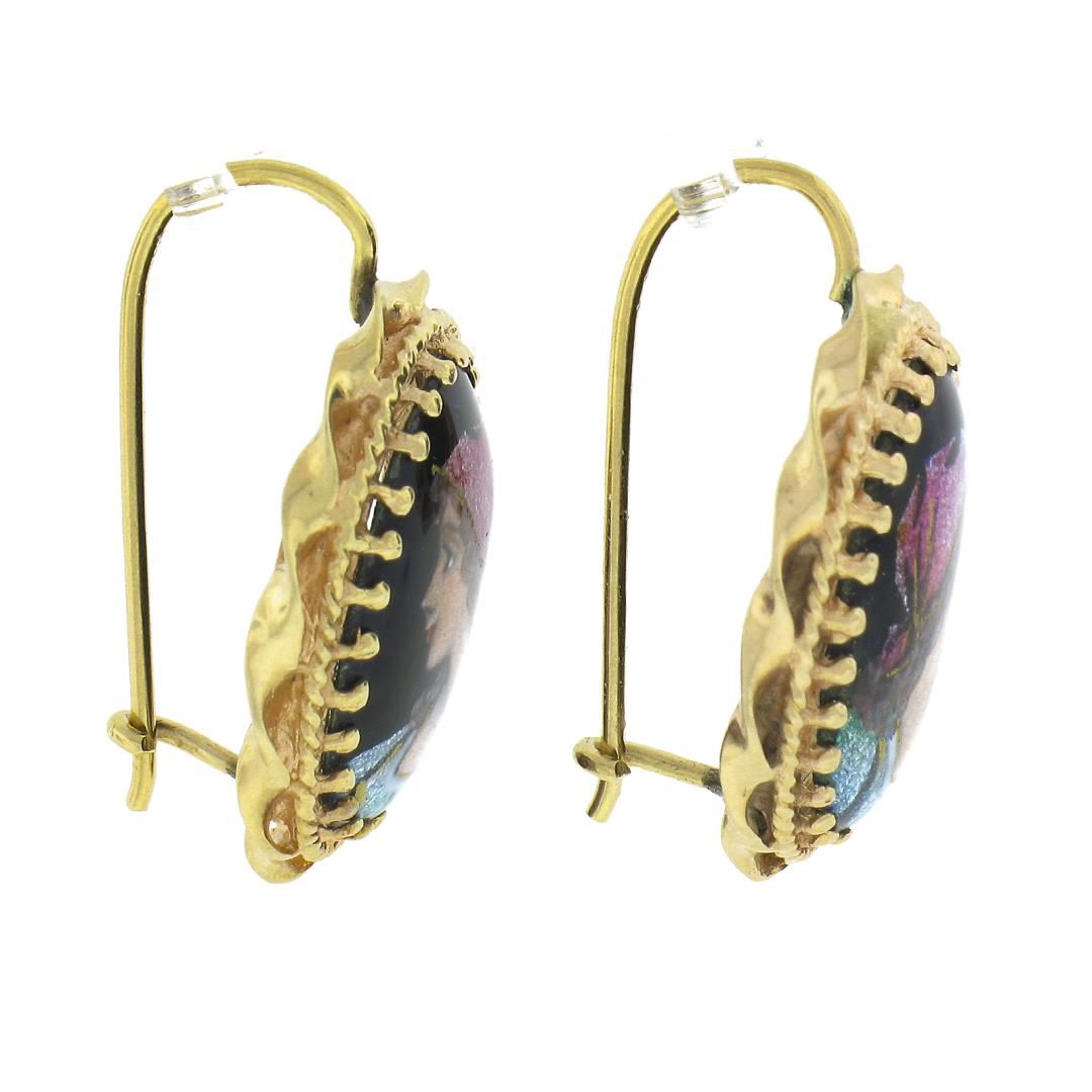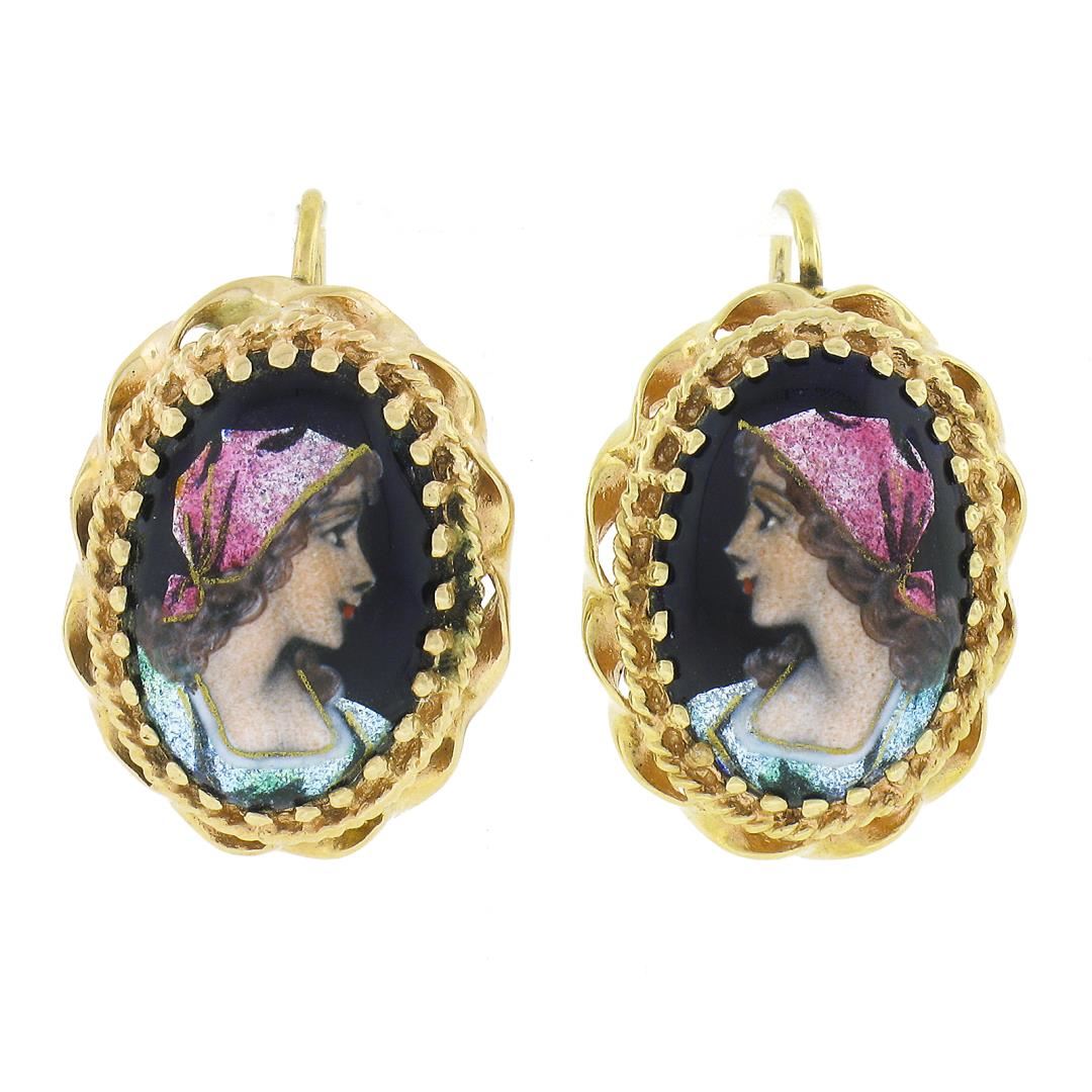 A vintage solid 14k yellow gold earrings, with 2 hand painted porcelain portrait. The earrings measure approximately 23.5x15.70mm and weigh a total of 5.81 grams.