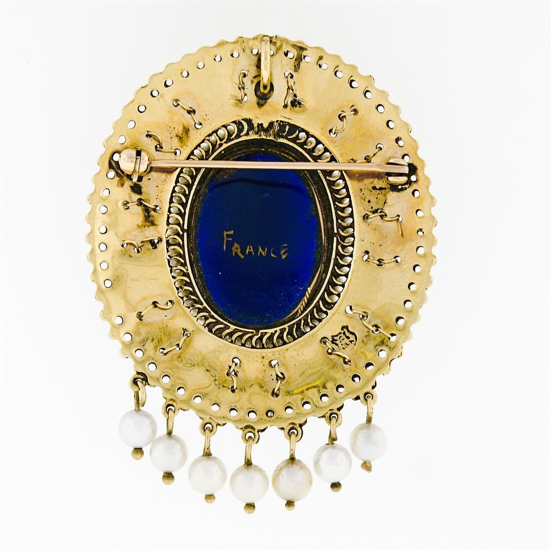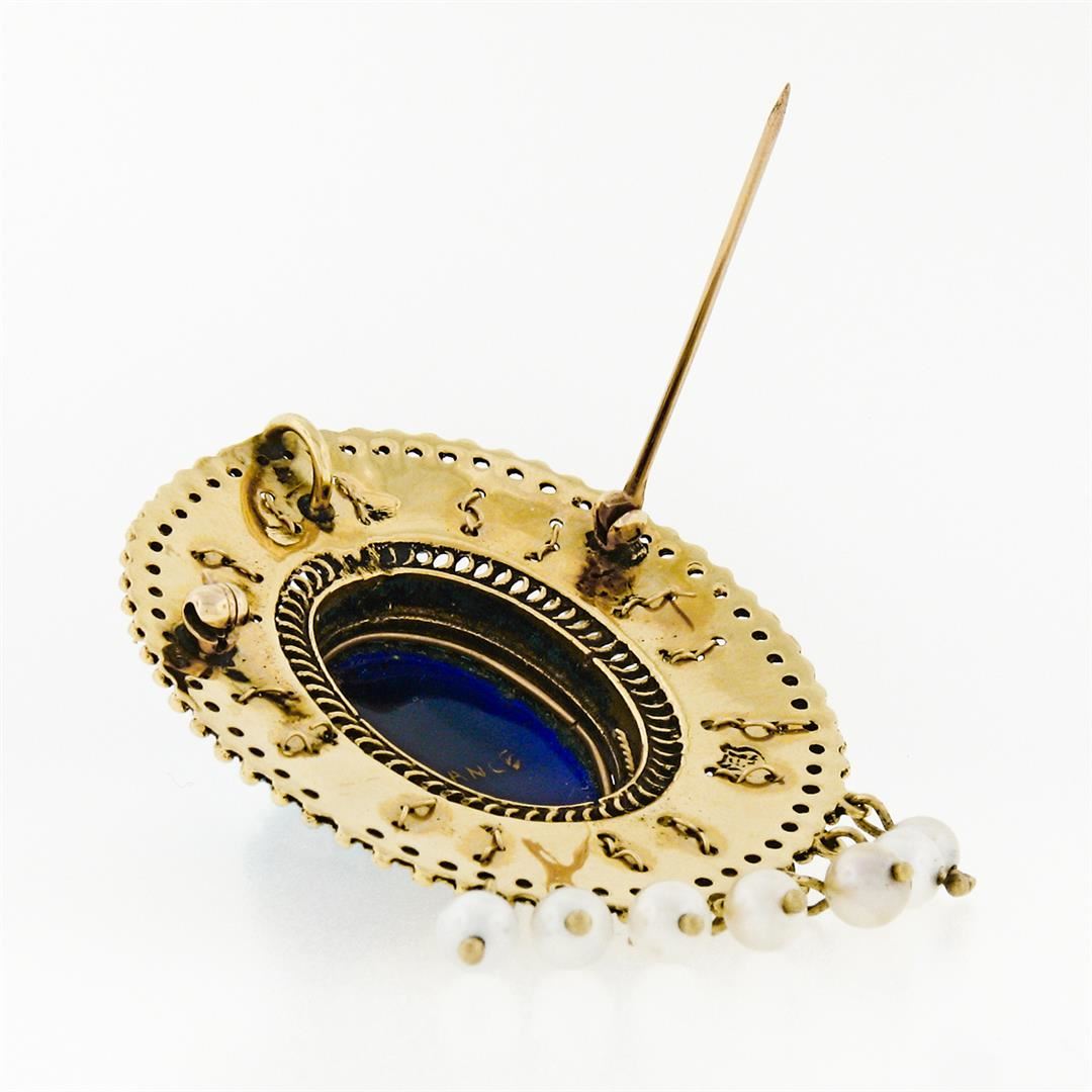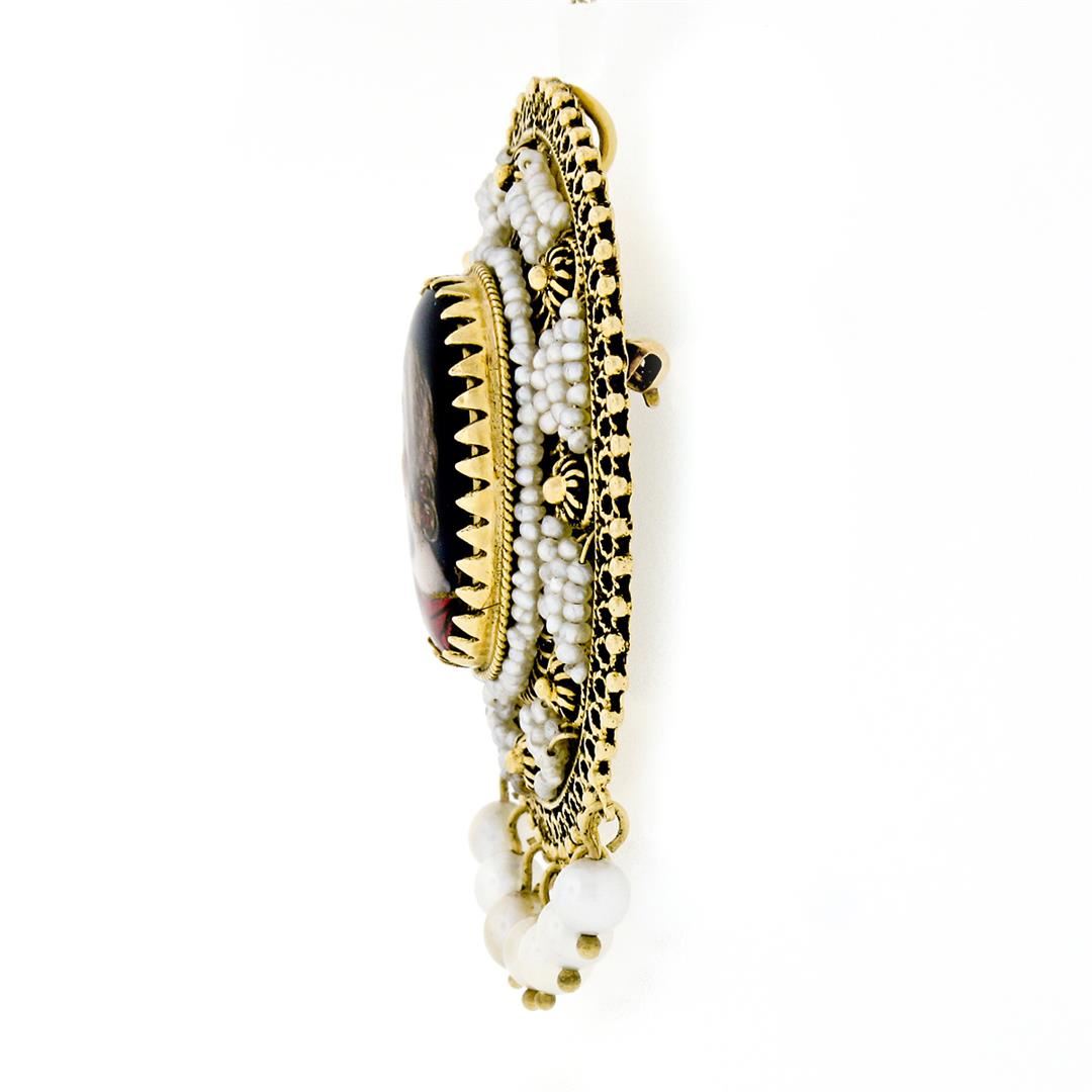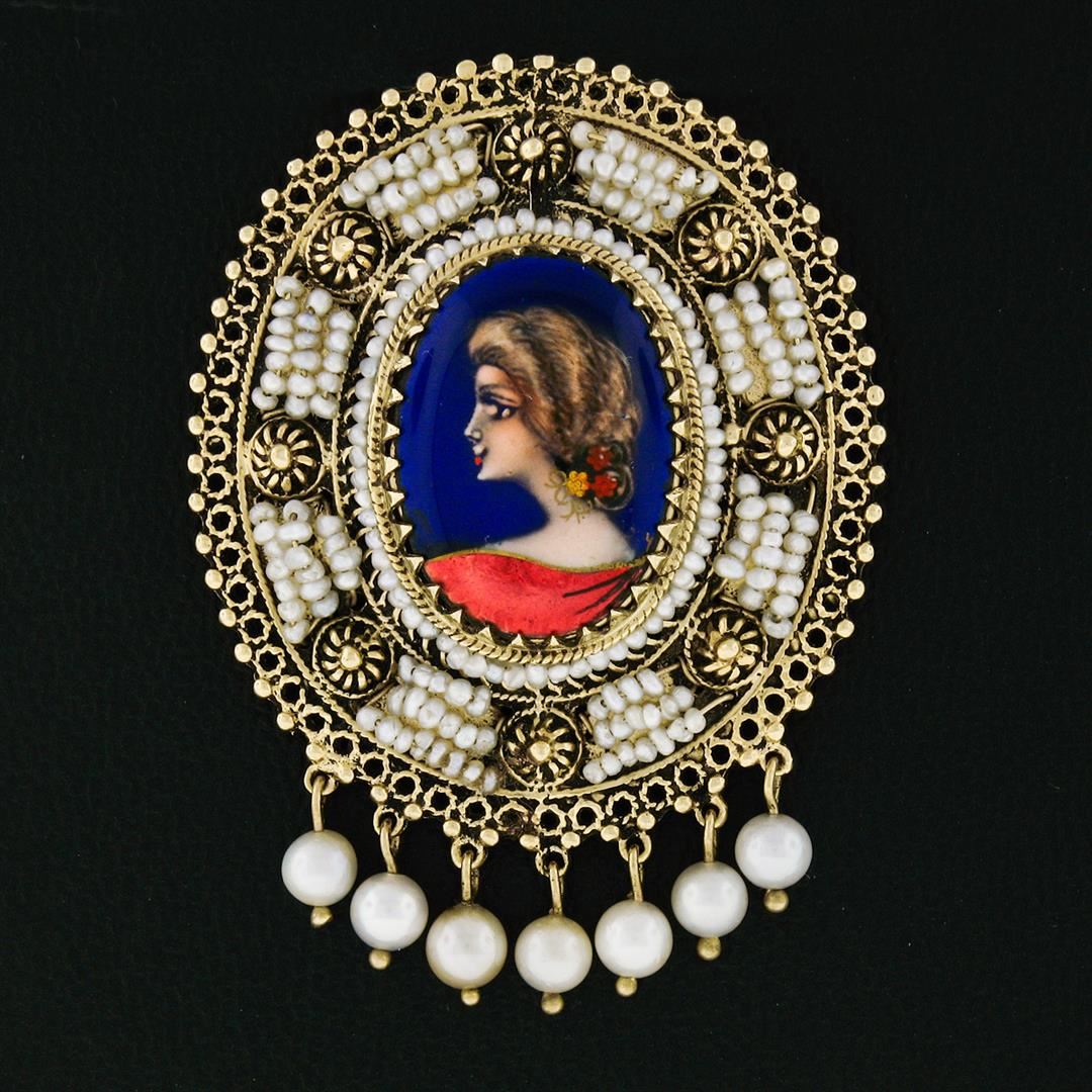 A vintage solid 14k yellow gold portrait brooch pendant, with numeral of natural seed pearls. Measures 51.2x37.4mm and weighs a total of 13.38 grams.