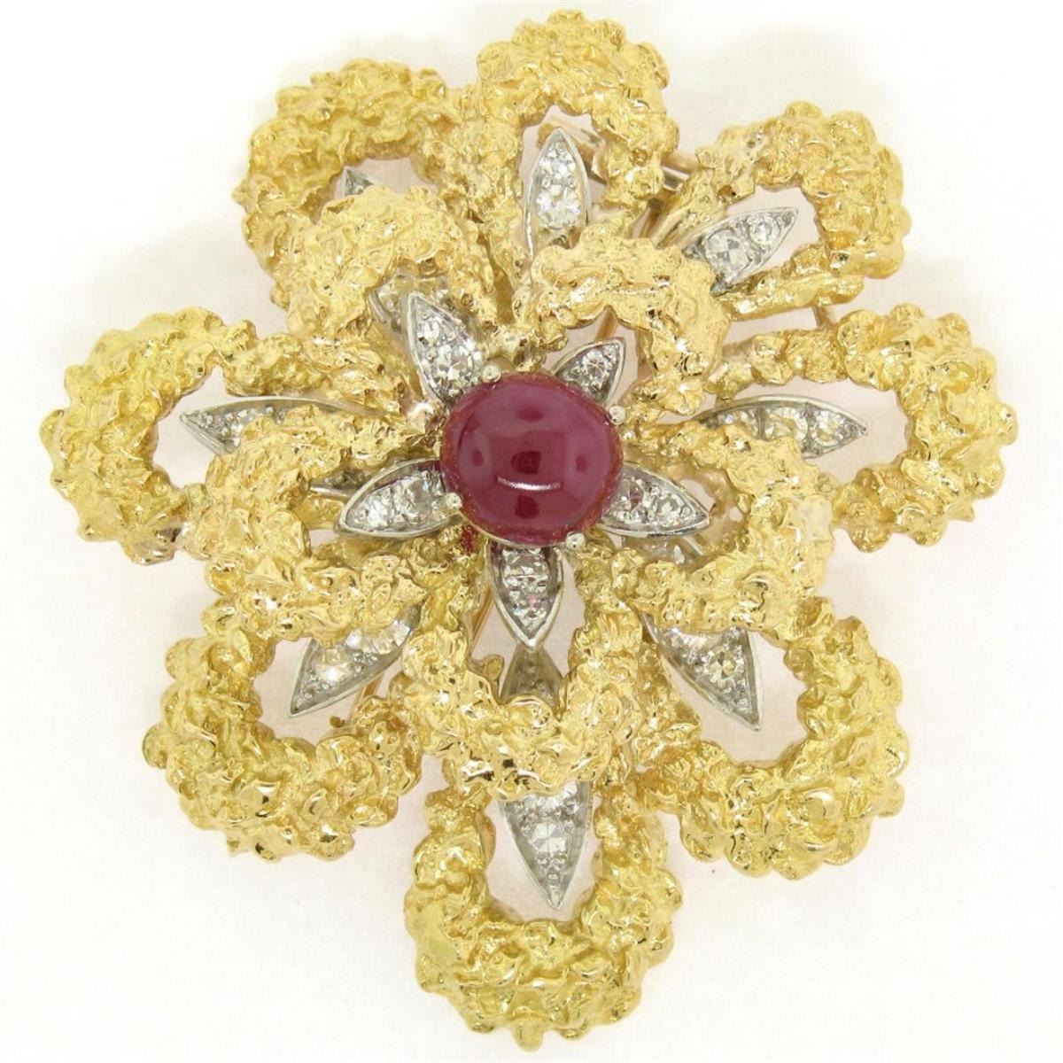One Vintage French 18K TT Gold 4.27ctw Diamonds & Ruby Textured Burst Flower Brooch. Item Details: Material: 18K Solid Yellow and White Gold, Total Weight: 31.83 Grams, Stone(s): (1) Natural Genuine Ruby - Round Cabochon Cut - Prong Set - Deep Blood Red Color - 8.81x8.26mm / 2.87ct (approx.), (34) Natural Genuine Diamonds - Pavé Set - Round Single Cut - F Color - VVS2 Clarity - 1.40ctw (approx.), Total Carat Weight: 4.27 (approx.), Overall Height: 47.10mm, Overall Width: 51.60mm, Overall Thickness: 12.05mm (at its thickest, not including the pin) Condition: Vintage piece. Excellent condition!