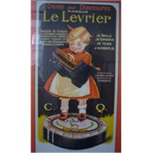A delightful advertising piece from the 1920's, French. The text reads, in part: Creme pour chassures (shoe polish), Marque Le Levrier: Specialite de prduits pour le finissage de chaussures ...je brille, je tiens, je conserve, j'assouplis (I keep your shoes bright, I keep them in good shape and soft ...)Image size 10 x 19, framed size 18 x 27. Printed by Baudry. Cocu. Mairesse, Quaregnon. In excellent condition. Please note that all of our posters, prints, pochoirs and ephemera are vintage, non-reproduction pieces. Please check out our other items for sale on this site - we add new items regularly. Please e-mail any requests for additional information or photographs. Thank you!