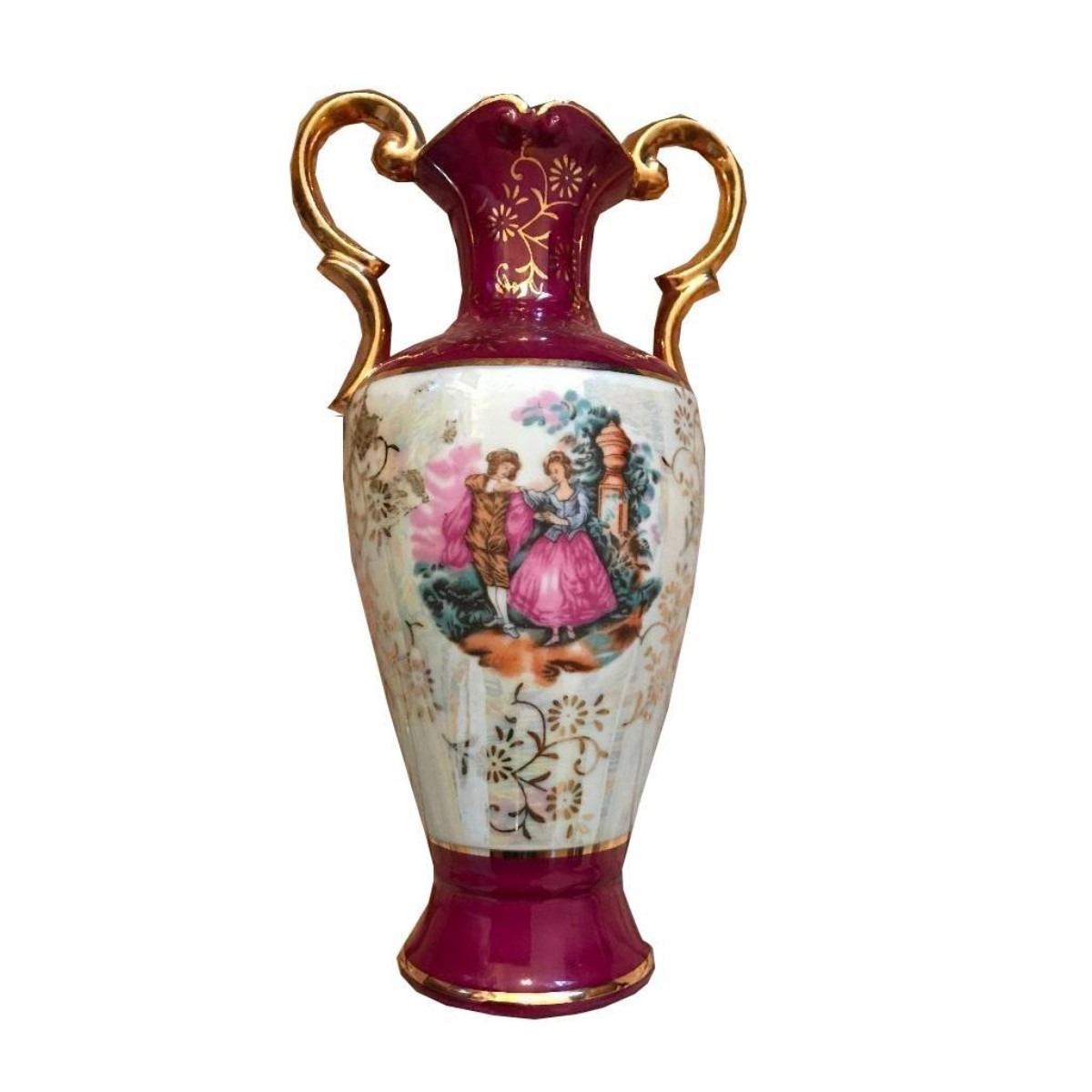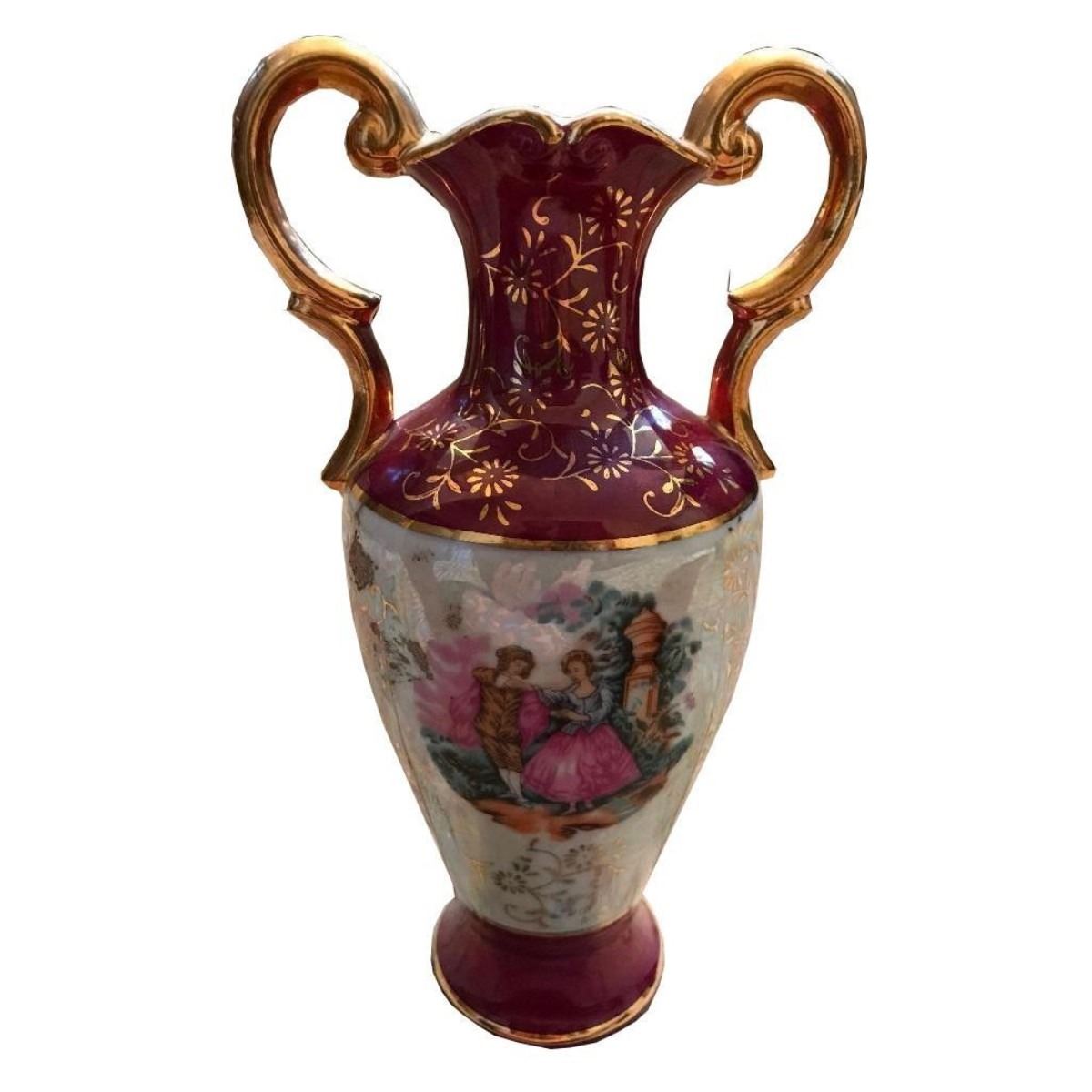 Vintage Limoges France burgundy & gold gilt double handle  lusterware porcelain vase with Fragonard courting scene. 9" H X 5" W.