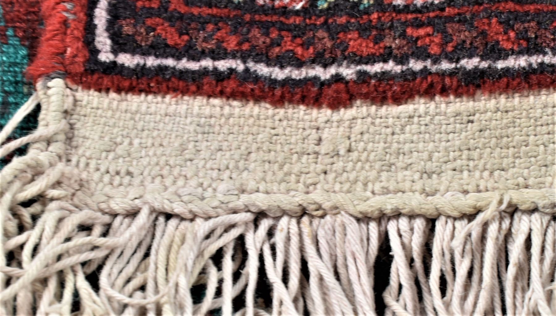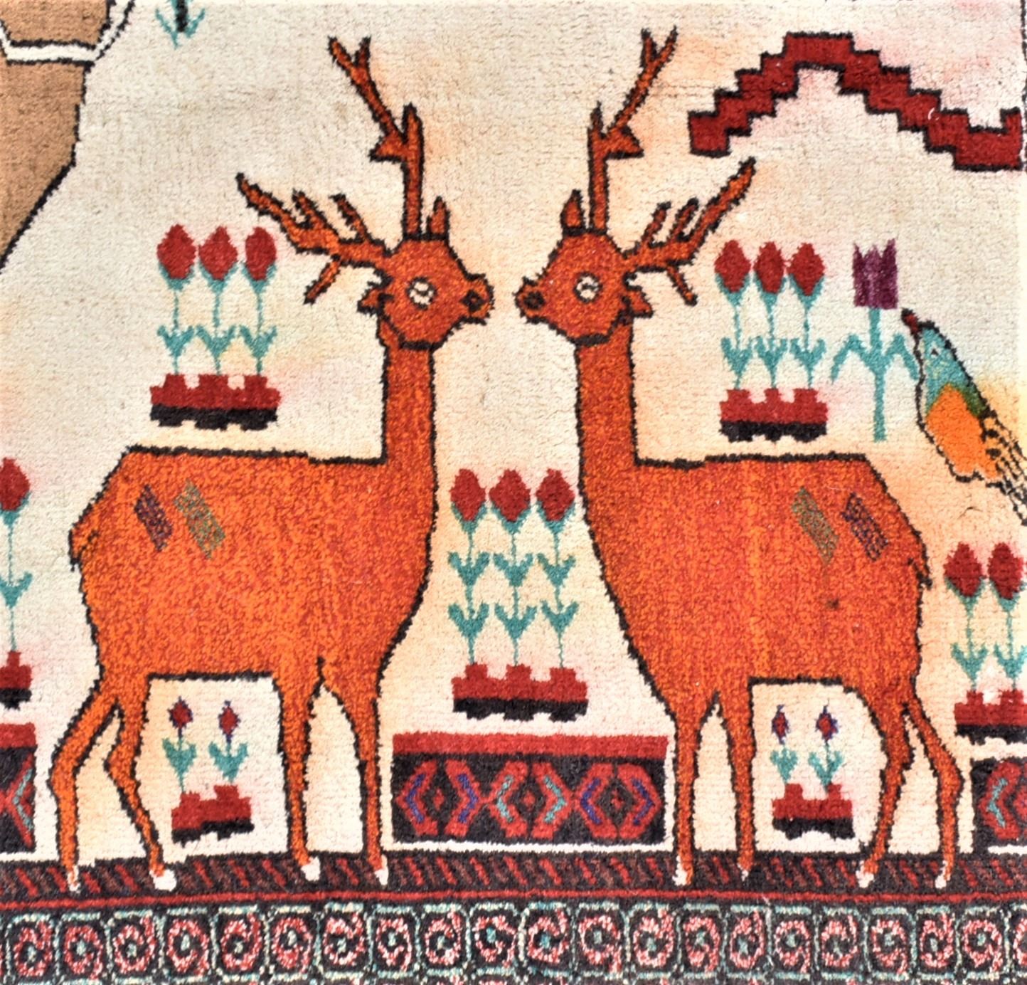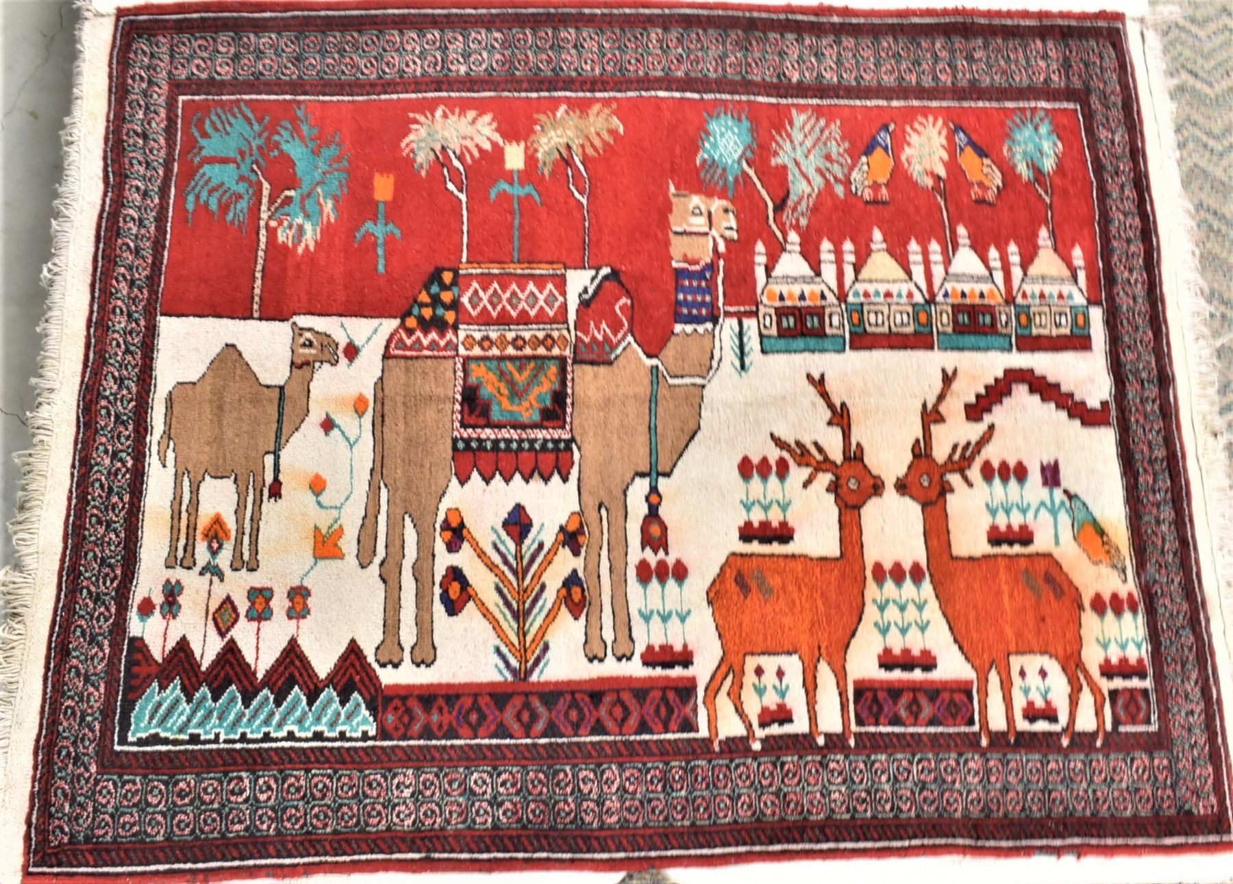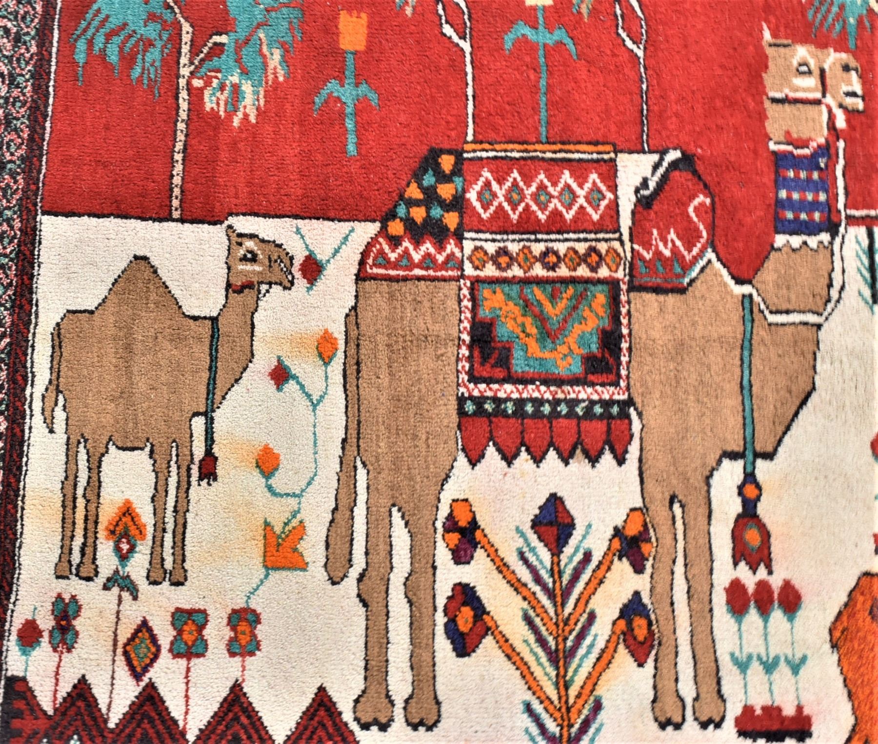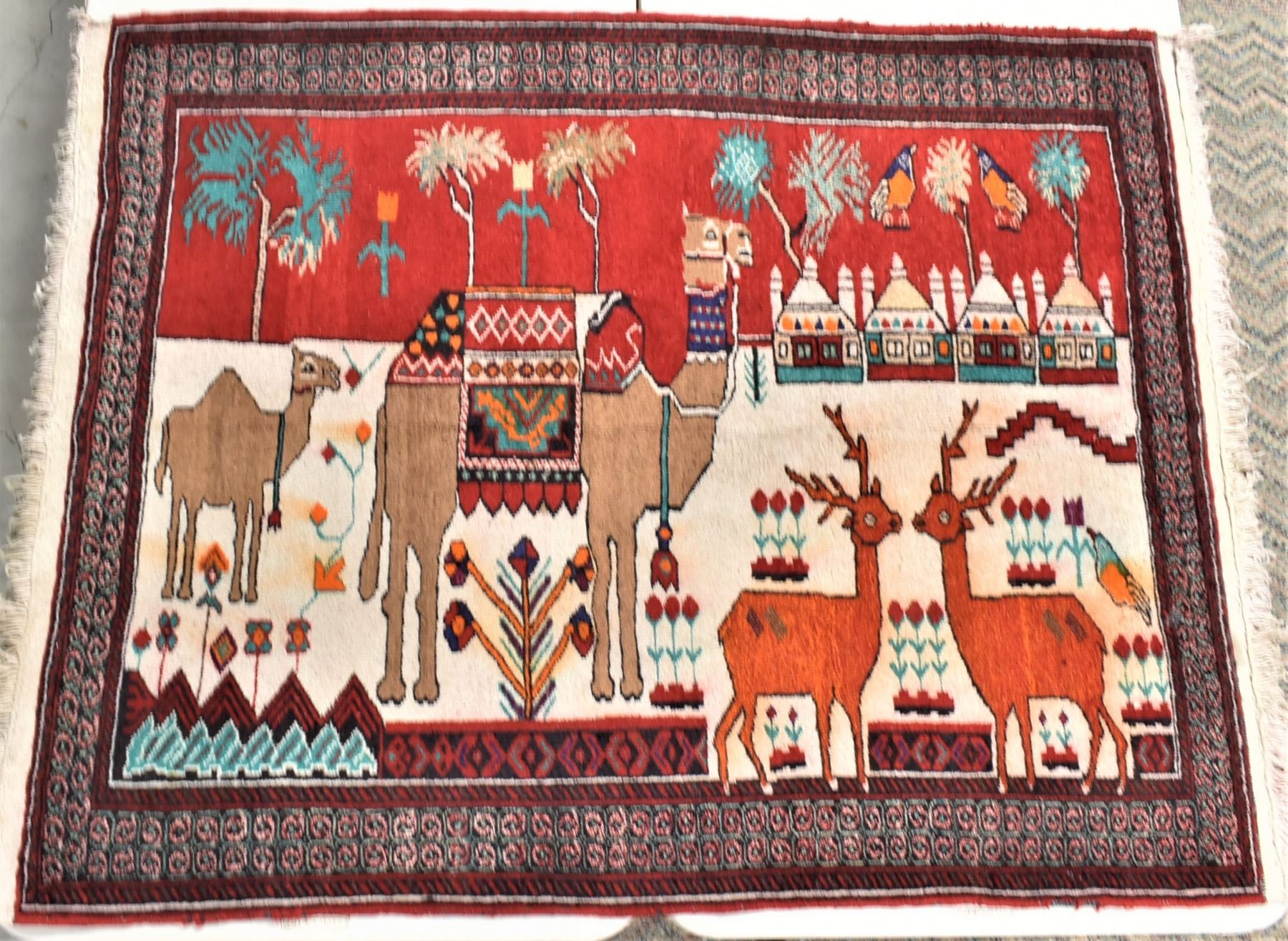 Antique Vintage Fringed Persian Rug, Camel Motif, measures 60'' x 64'', some bleeding