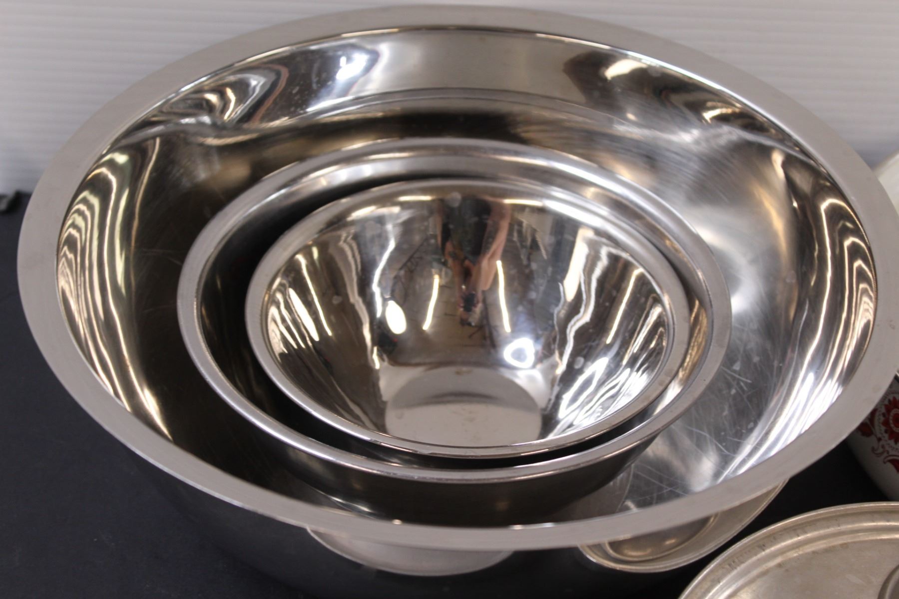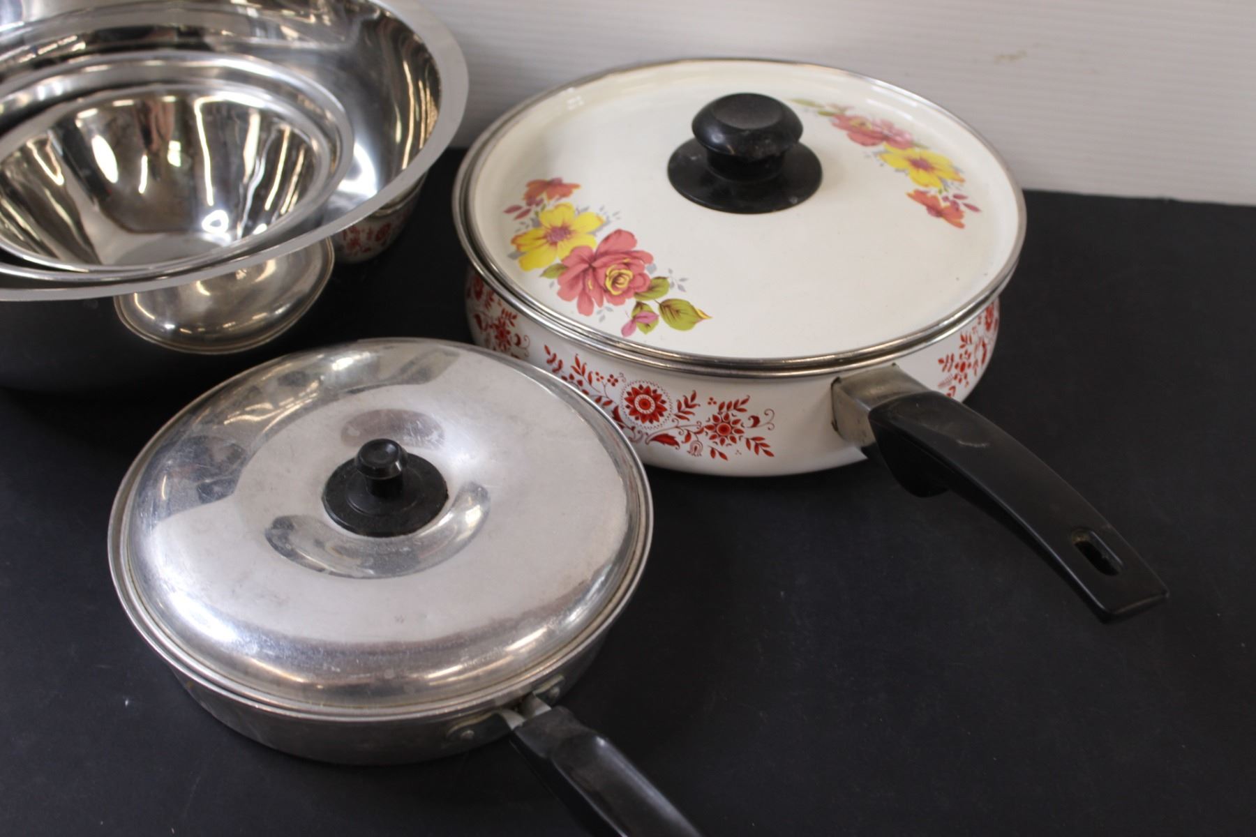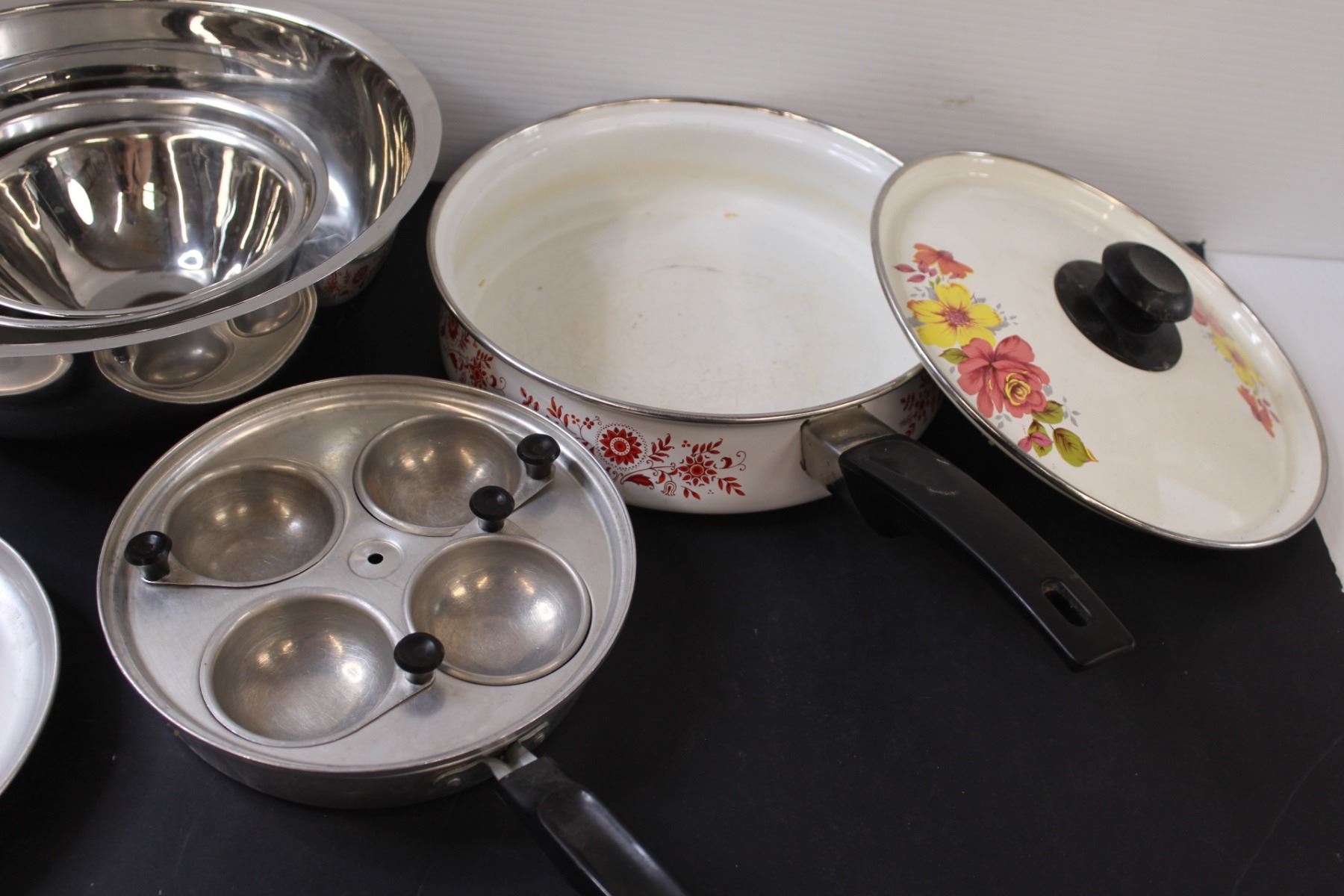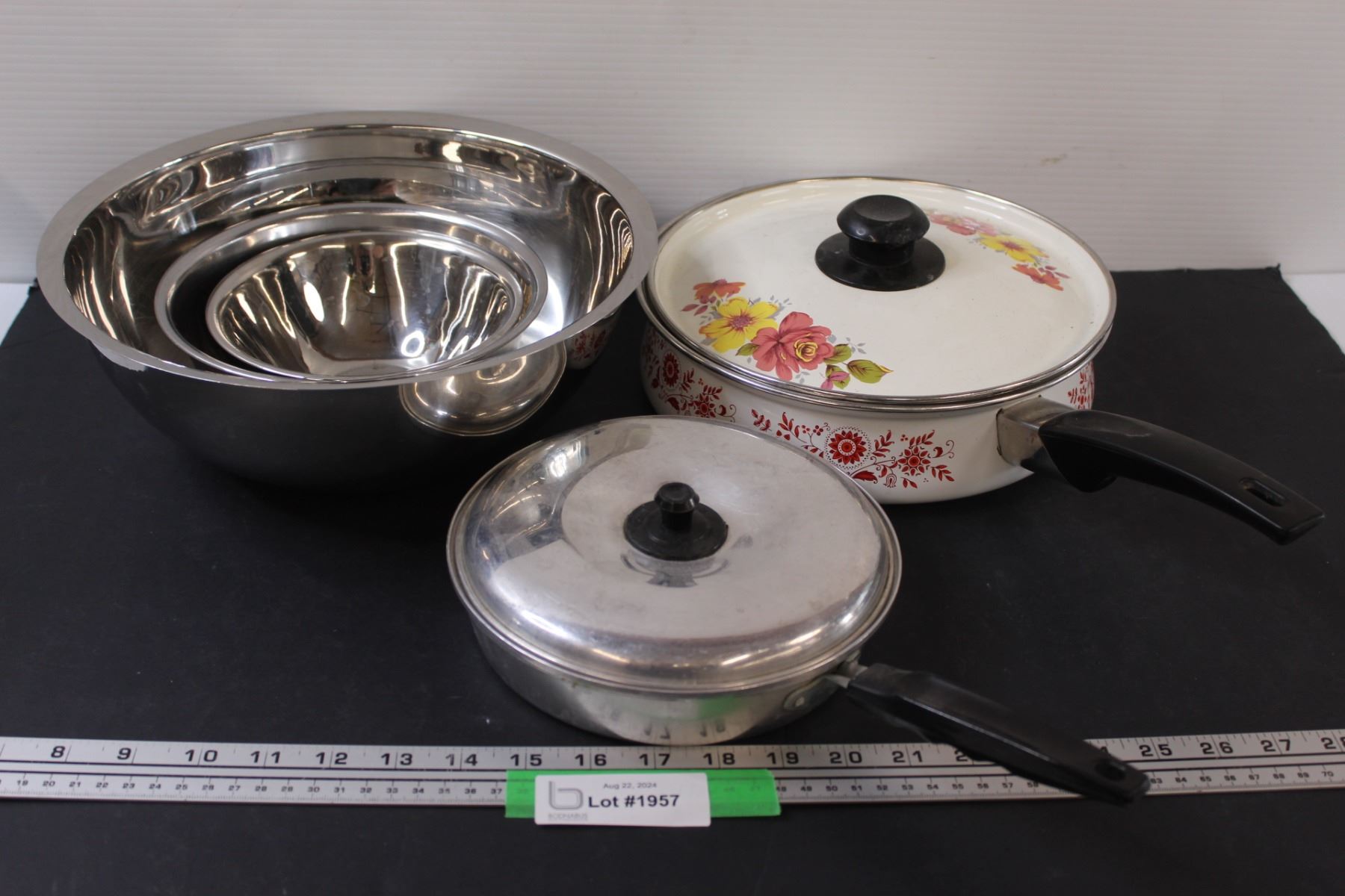 Vintage Frying Pan & Poached Egg Pan & (3) Metal Bowl Set