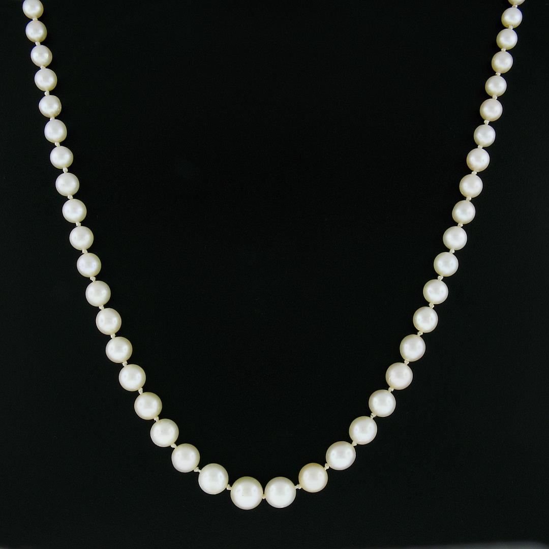 A vintage strand necklace with 14k white gold clasp, featuring 59 GIA graded near round shape cultured akoya pearls (5.34 mm to 10.20 mm), and 16 old single cut natural diamonds (F/G - VS1/VS2 ; 0.64ctw). 21 inch strand link chain, 37.80 grams total weight. Comes with all original relevant certifications.
