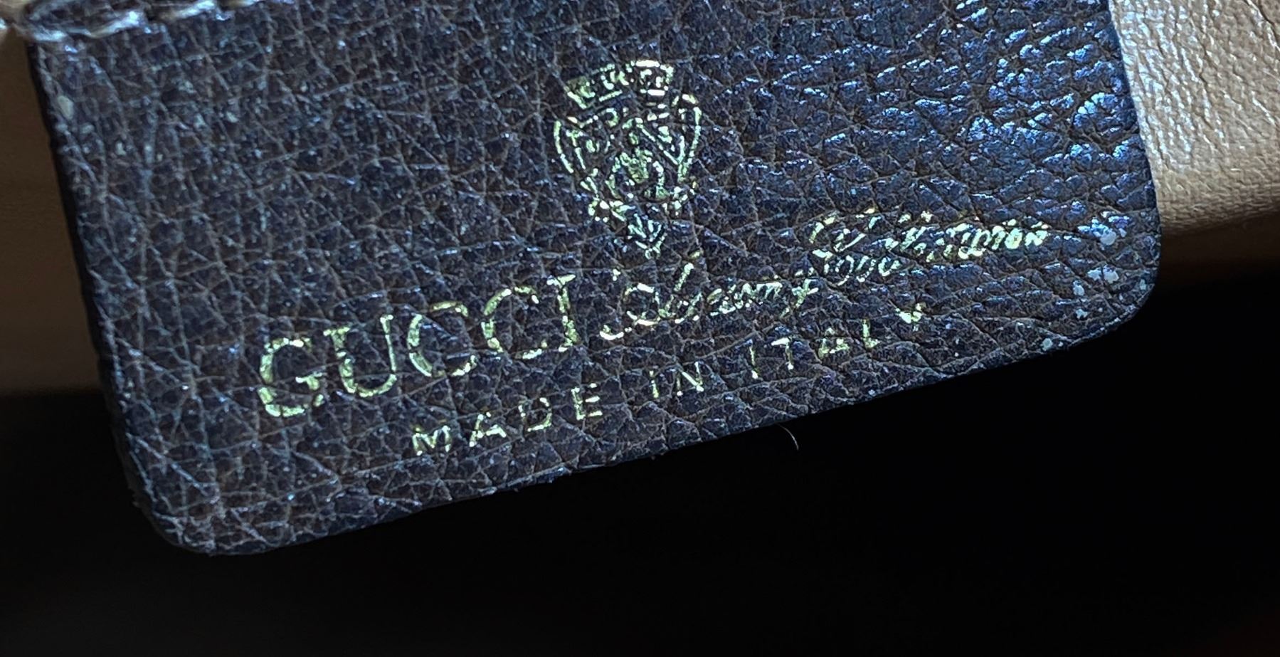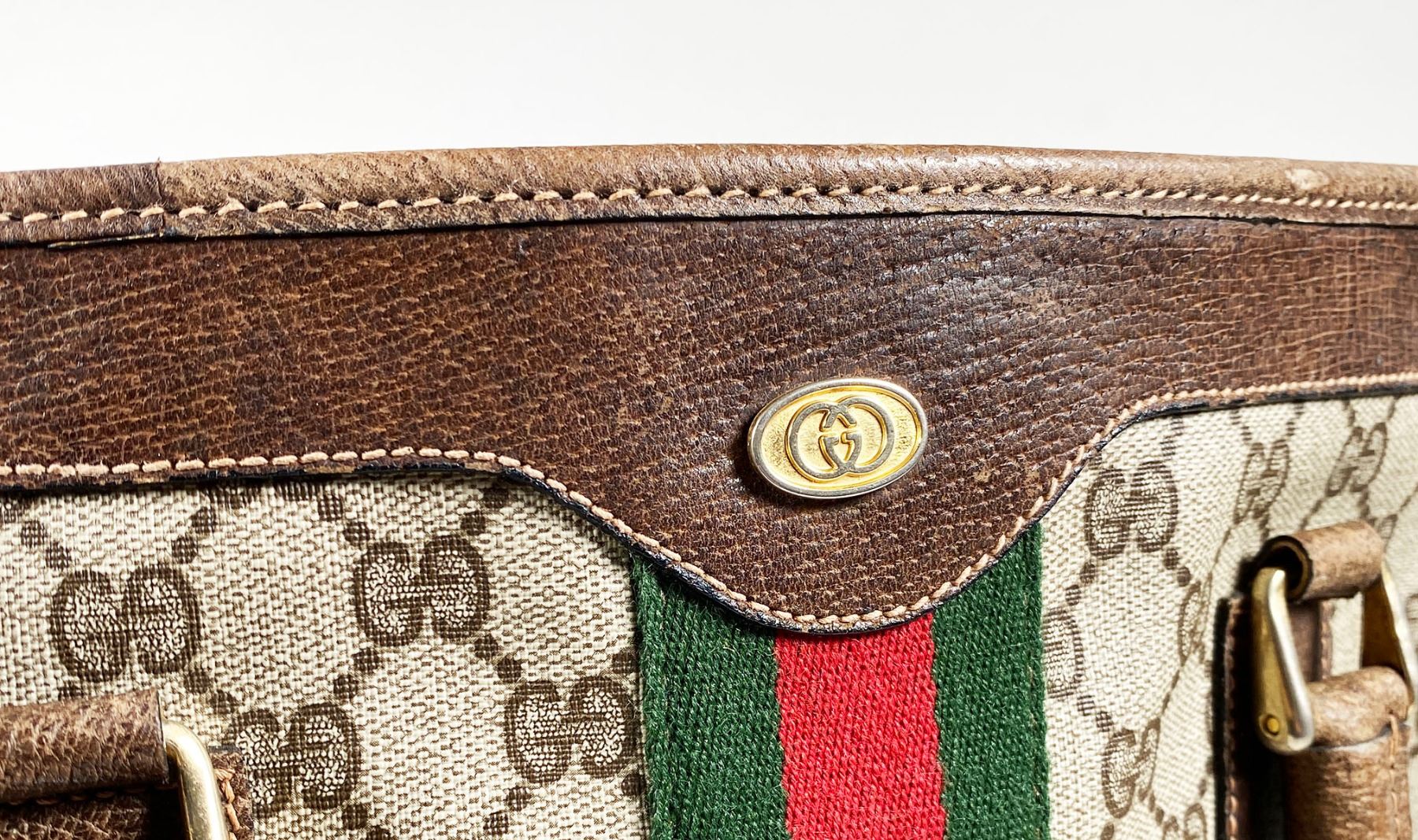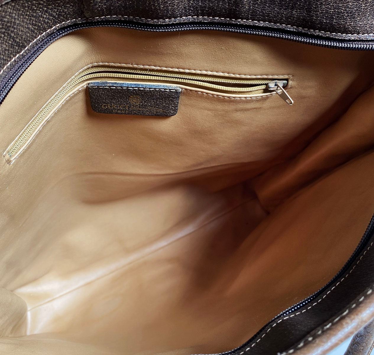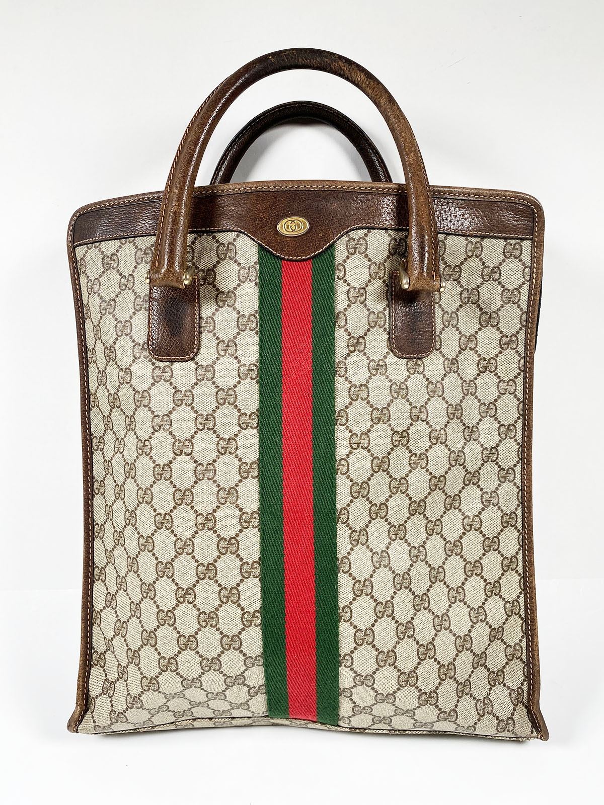 Vintage GUCCI mono tote, brown. Bag measures approx. 16" tall x 14 1/2" wide. Tote is in good condition with normal to light wear. No holes, rips, stains or ink marks. Zippers work properly. See photos for more details on condition. PLEASE NOTE: This item is unconditionally guaranteed authentic, without reservation or time limit.