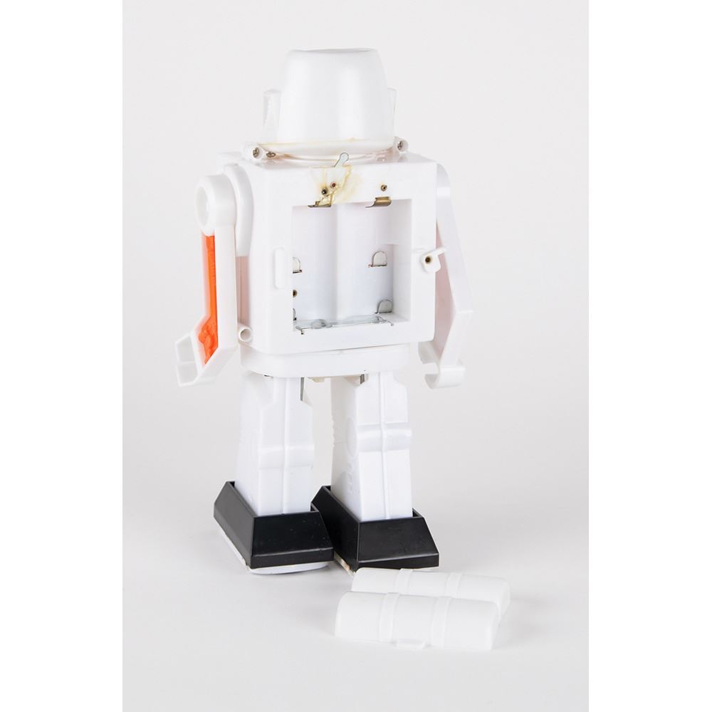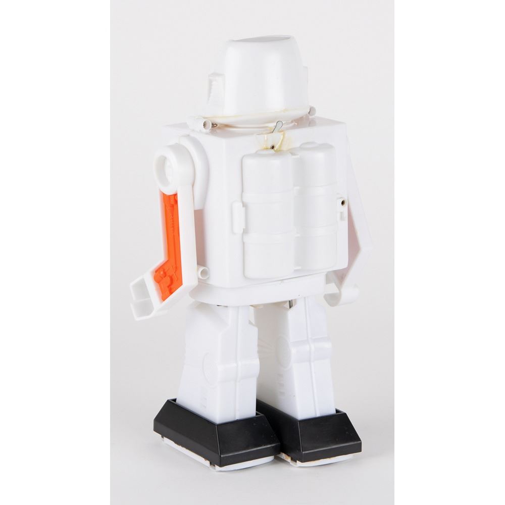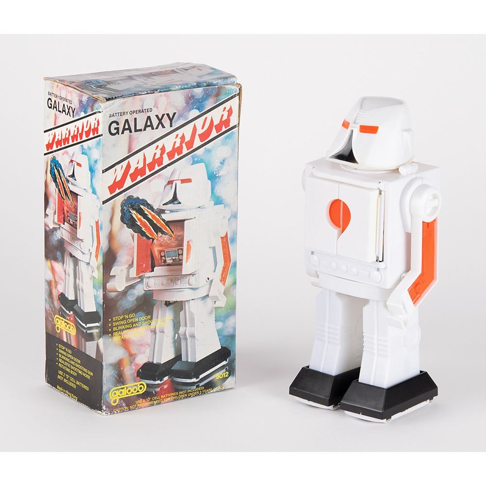 Vintage circa 1970s battery-operated "Galaxy Warrior" robot, made in Hong Kong by Galoob, standing at 11Àù tall. The white plastic robot features standard "stop'n go" action, swing open door, blinking gun with realistic noises, and a rotating torso. Includes the original box.